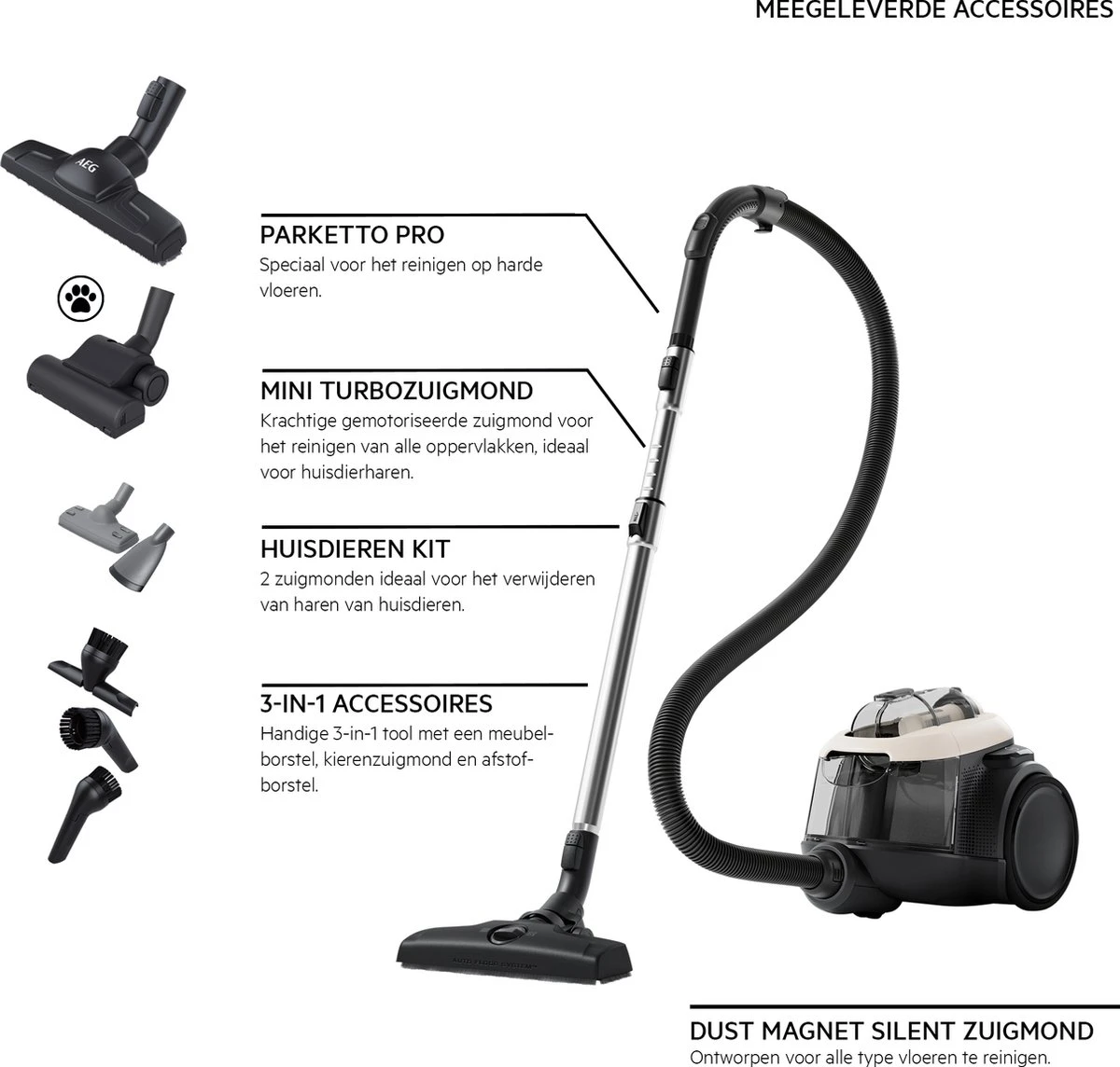 Het compacte design van de AEG Animal 6000 zorgt ervoor dat deze makkelijk op te bergen is. Afhankelijk van de opbergruimte waar je het plaatst kan je ervoor kiezen om dit horizontaal of verticaal op te bergen. De beperkte grootte en het compacte formaat maken het extra gemakkelijk om de stofuizger op te bergen.