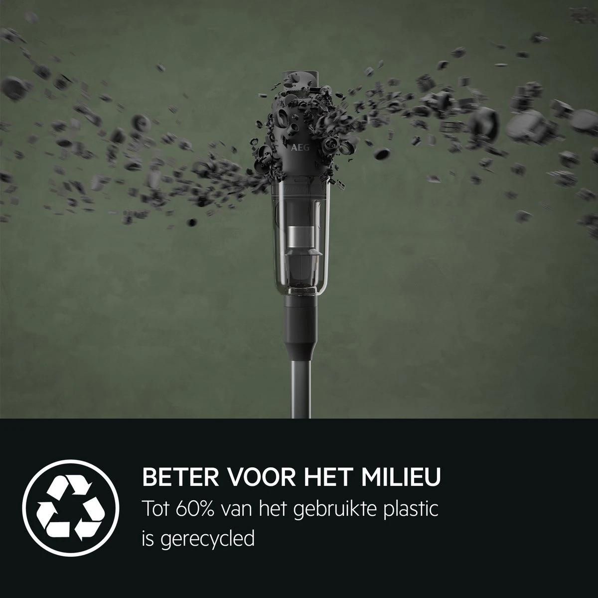 De steelstofzuiger bestaat tot 60% uit gerecycled plastic. Daarnaast heeft het een uitneembare, verwisselbare en recyclebare accu. Dit zorgt ervoor dat de levensduur van de steelstofzuiger wordt verlengd. En als laatste bevat het geen verf. Dit alles zorg voor een verantwoorde keuze waardoor het beter is voor het milieu.