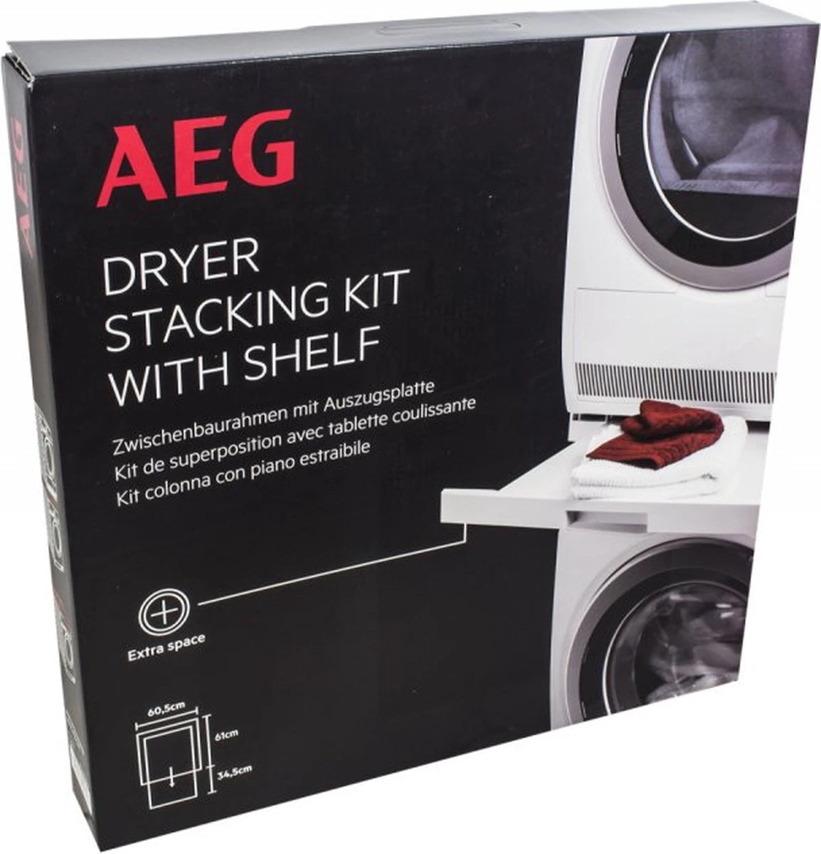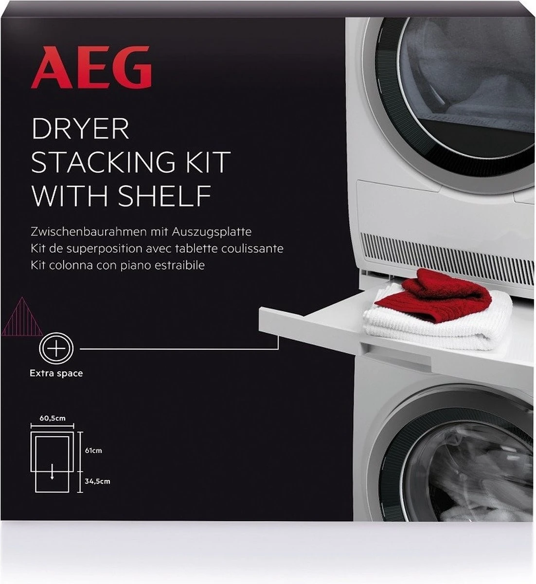 Deze AEG stapelkit is geschikt voor wasmachines en drogers van 60 cm breed en 52-67 cm diep.