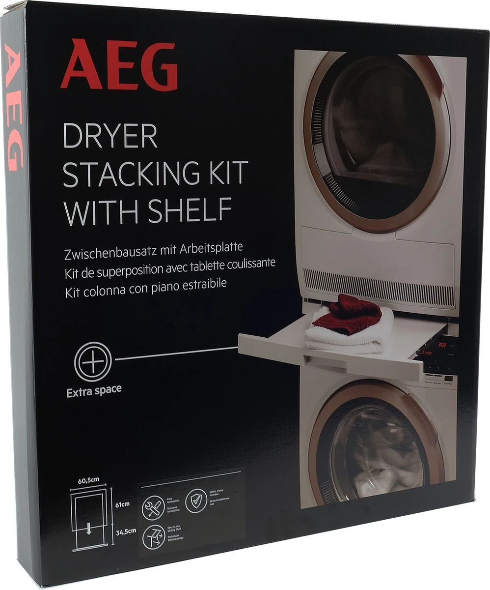 Met deze stapelkit kun jij je wasdroger veilig, stabiel en zonder bevestigingen boven je wasmachine plaatsen, dankzij de Safety Strip. Zo creëer je meer ruimte in je badkamer of wasruimte. De uitschuifbare lade (Sliding Shelf) schuift maximaal 34 cm uit, zorgt voor gemakkelijk in-en uitladen en een praktische plek om je wasgoed op te vouwen. Inclusief muuranker.