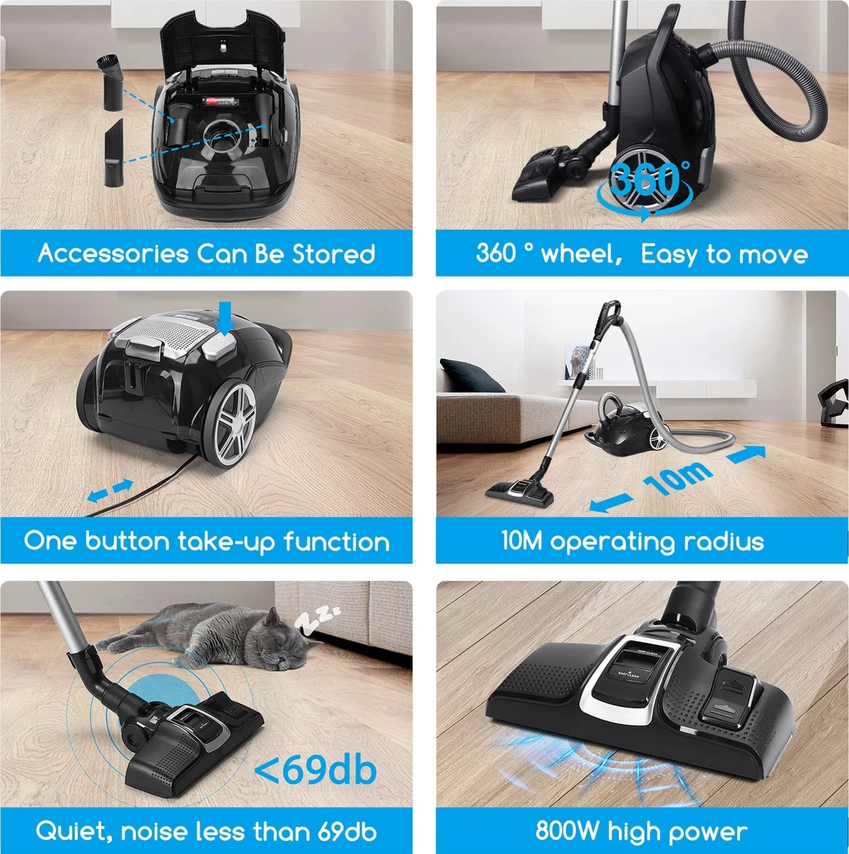 De Aigostar Gordon stofzuiger met zak maakt gebruik van HEPA 13 filtertechnologie. Deze technologie zorgt ervoor dat 99.9% van het stof wordt gefilterd. In vergelijking met traditionele stofzuigers is de Gordon stofzuiger dus een geschikte stofzuiger voor mensen met allergieën. De Hepa 13 filtersysteem voorkomt dat je in contact komt met stof en andere allergenen. Het vermogen van 800W en de 5 zuigkrachtniveaus kunnen worden aangepast om ervoor te zorgen dat je de kamer efficiënt en snel kunt schoonmaken.