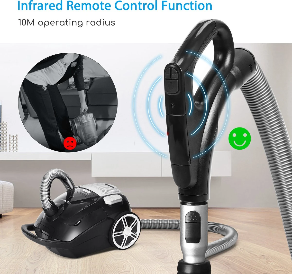 Vergeleken met andere stofzuigers met zak, is de Gordon stofzuiger voorzien van een speciale functie. Het handvat van de stofzuiger is uitgerust met een infrarood-afstandsbediening. Hiermee kun je de zuigkracht aanpassen en aan/uit-schakelen zonder dat je hoeft te bukken.