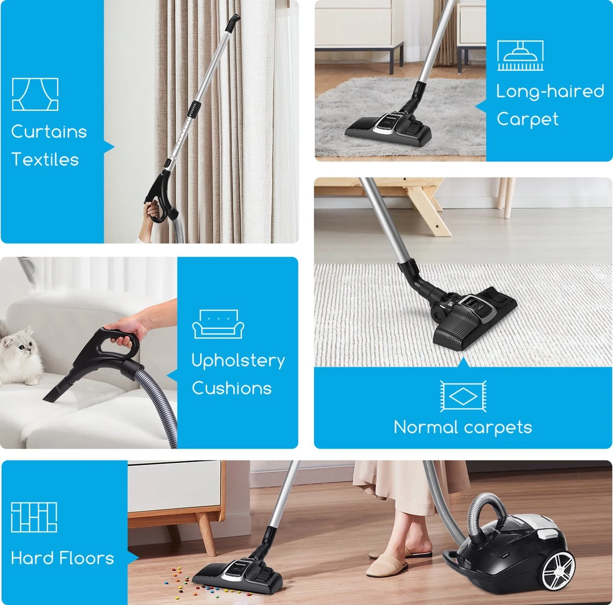 De stofzuiger is geschikt op gordijnstoffen, langharige tapijten, bank, vloerkleden, harde vloeren en normale tapijten. Hij wordt geleverd met een hoofdborstel, meubelzuigmond en kierenzuigmond. De verschillende zuigkrachtniveaus maakt het mogelijk om aan verschillende reinigingsbehoeften te voldoen. Daarnaast kun je met de kierenzuigmond ook de moeilijkere plekken schoonmaken. Met een actieradius van 10 meter maak je zo een groot oppervlakte schoon zonder van stopcontact te wisselen.