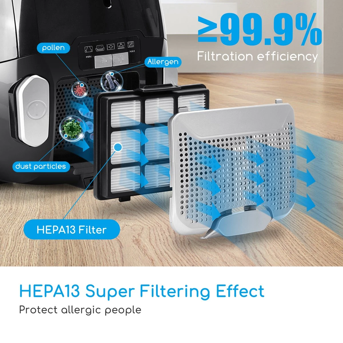 De stofzuiger met zak maakt gebruik van het Hepa 13-filtersysteem, dat 99.9% van de stofdeeltjes, pollen en allergenen in de lucht kan filteren en mensen met allergieën kan beschermen.