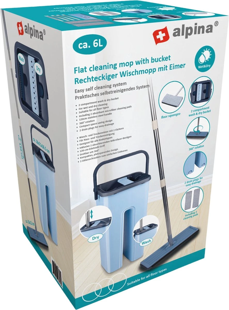 De alpina dweilset mop met emmer is perfect voor het schoonmaken van alle harde vloersoorten. Denk daarbij aan een houten vloer, laminaat, tegels, vinyl, PVC en betonnen vloeren. Je kunt de vloerwisser en microvezel pads zowel nat als droog gebruiken voor een perfect en schoon resultaat. Met zijn 360 graden draaibare kop bereik je ook met gemak schuine plaatsen en hoeken.