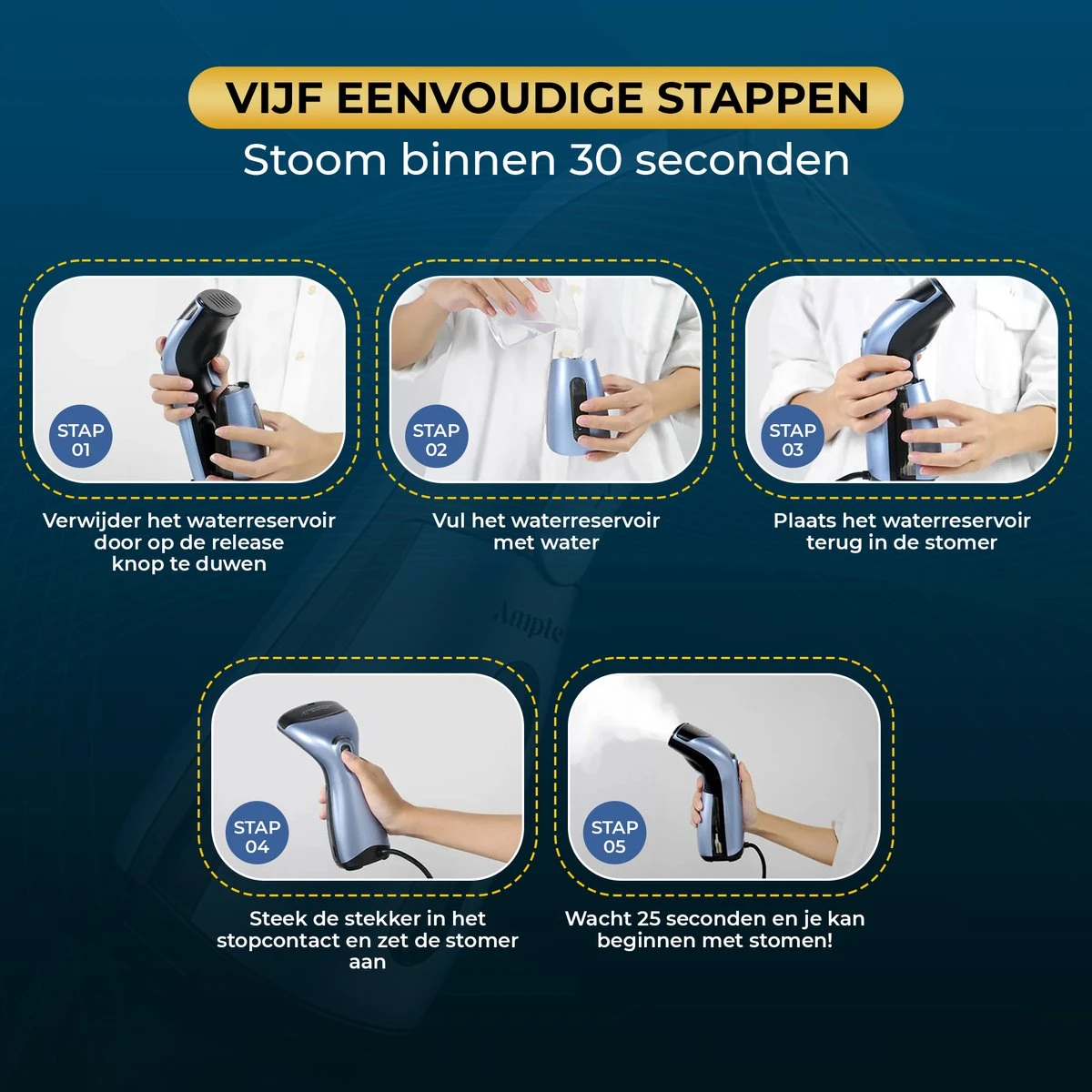 Het waterreservoir van de kledingstomer bedraagt 120 ML en is binnen 25 seconden opgewarmd! Met deze capaciteit kan je zo’n 15 minuten onafgebroken jouw kleding, gordijnen, lakens, zijde hemden, pakken, kostuums, knuffeldieren en nog veel meer gladstrijken en voorzien van een opfrisbeurt.