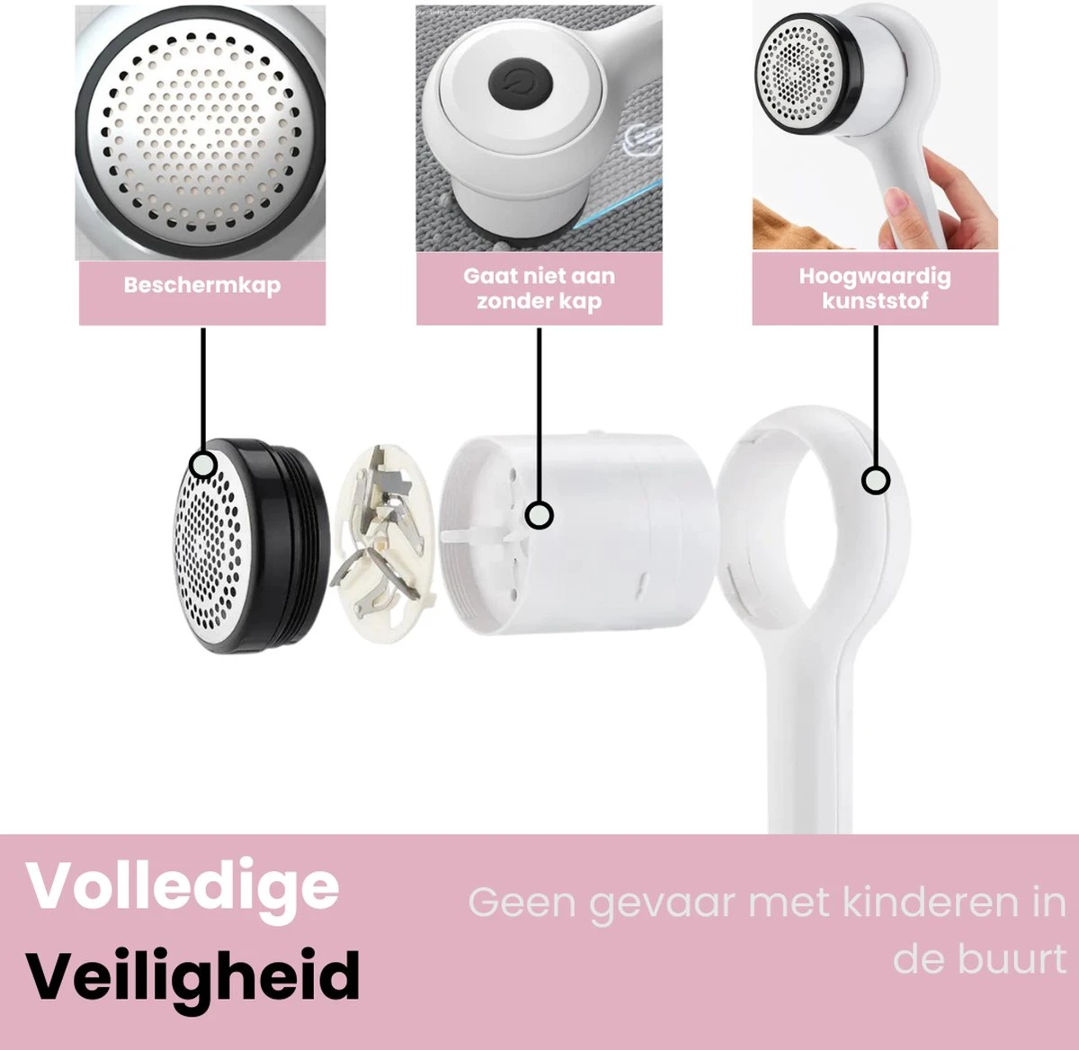De pluizenverwijderaar is zeer makkelijk schoon te maken. Je hoeft alleen het voorste kapje eraf te halen daarna kunt u alle pluisjes direct weggooien. De messen raken ook niet verstopt omdat de pluisjes direct naar beneden worden gezogen in het reservoir.