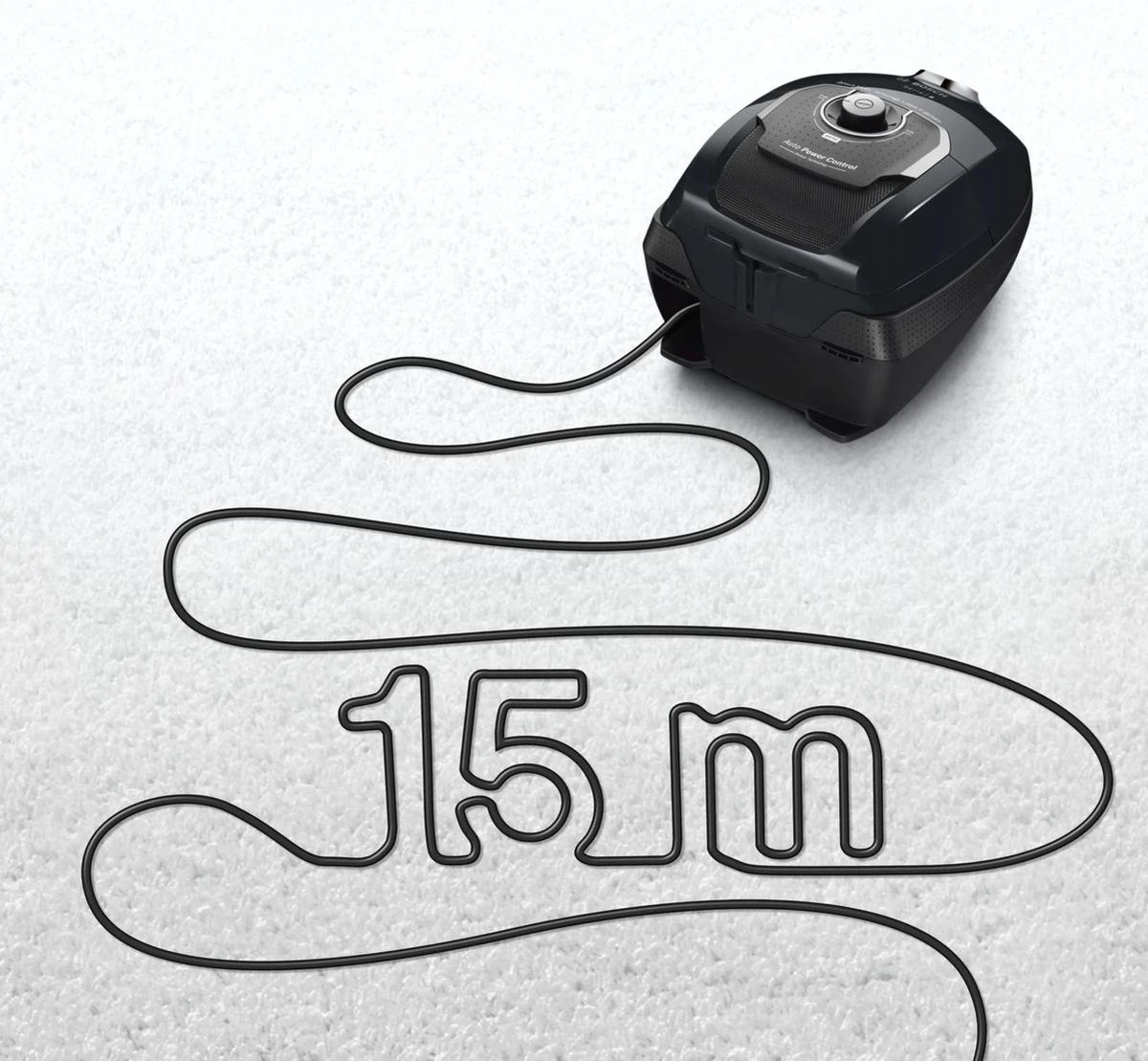 De Bosch In’genuis stofzuigers hebben dankzij het snoer van 12 meter een actieraduis van 15 meter, zo kun je in een keer een groot oppervalk stofzuigen.