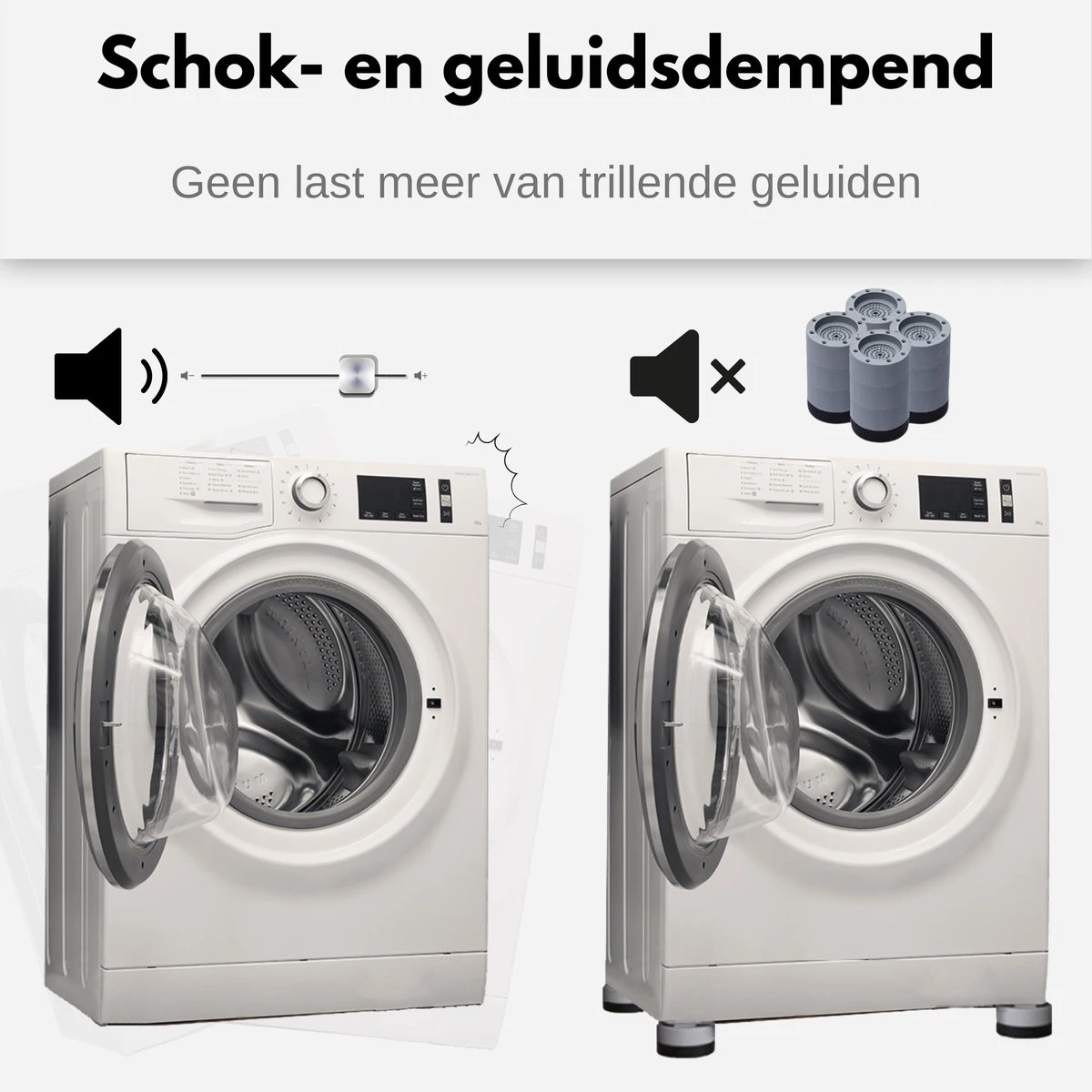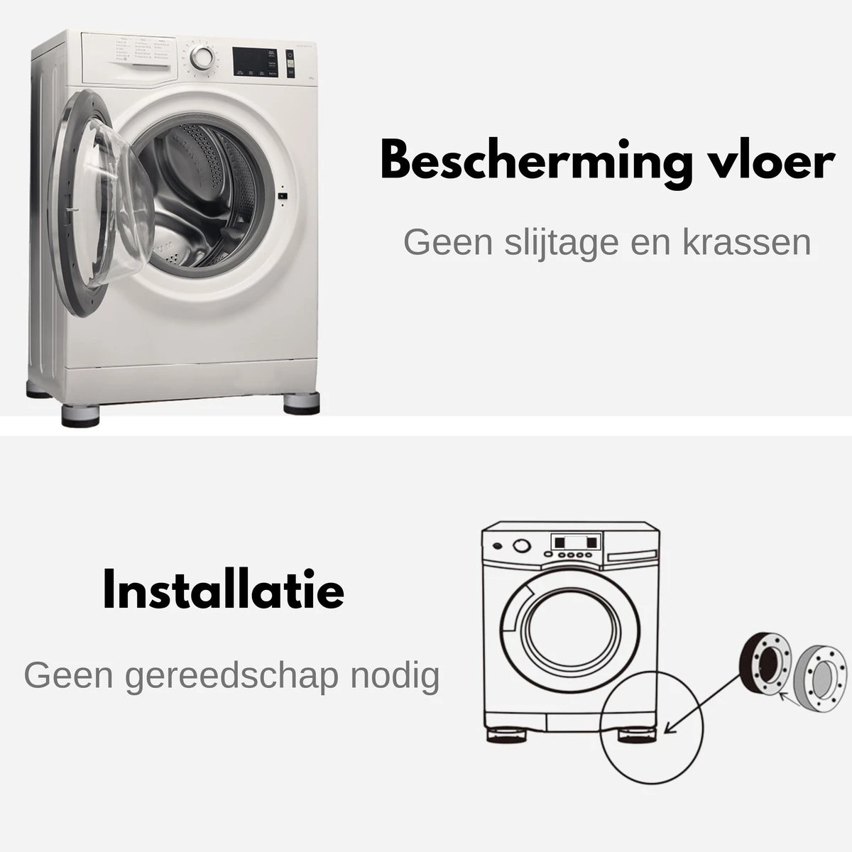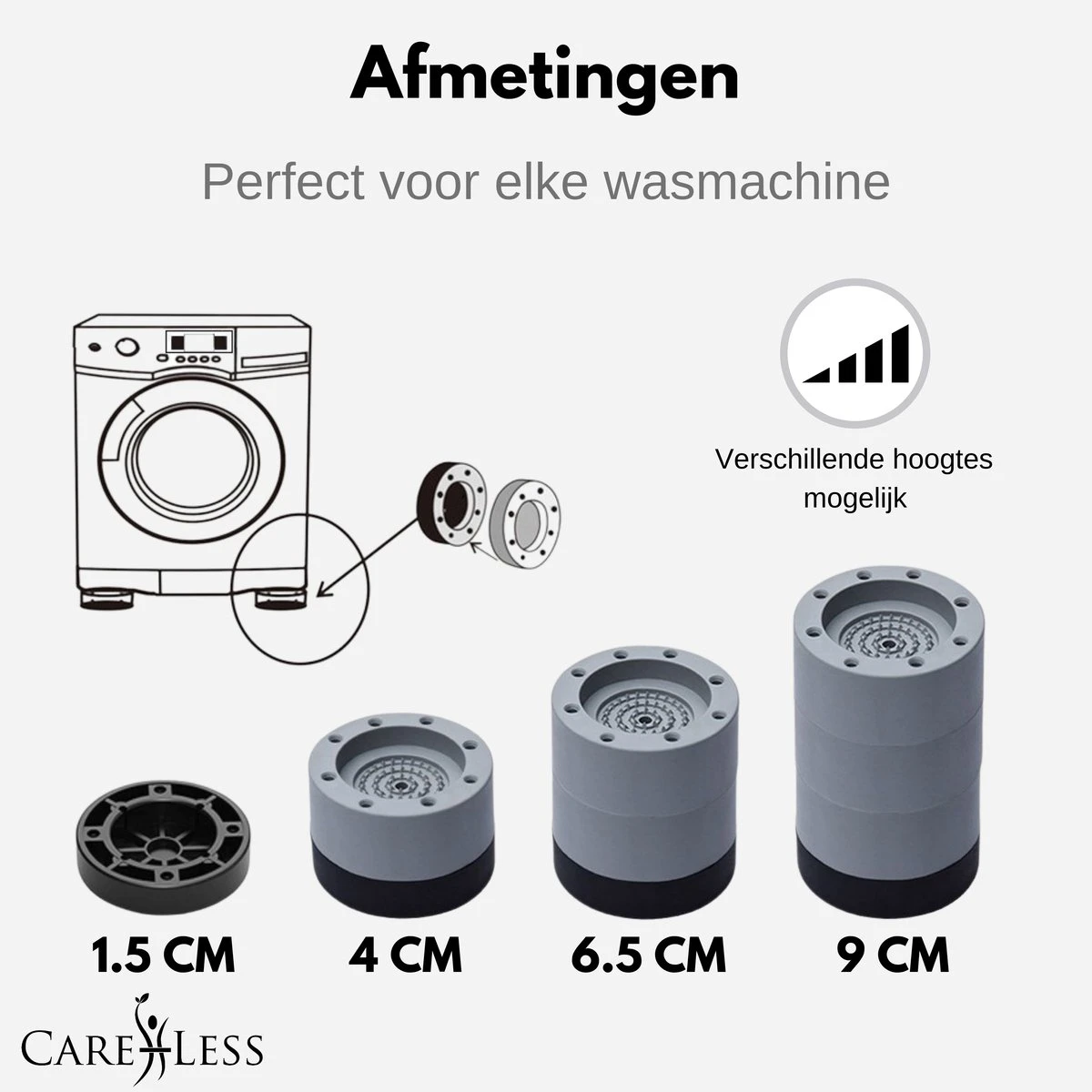 Ook zo’n hekel aan het gestoot, geschud en lawaai van je wasmachine? Wasmachines en drogers kunnen tijdens gebruik behoorlijk veel lawaai maken. Ze hebben de neiging om te bewegen en te schudden. Hierbij stoten ze vaak ongewenst tegen obstakels aan waardoor ze nog meer lawaai maken. Erg irritant! Met de wasmachine voeten van Care-Less wordt wassen weer aangenaam. De voeten absorberen het trillen van de wasmachine en zijn tevens voorzien van antislip waardoor de wasmachine keurig op z’n plek blijft staan tijdens het wassen. Installatie is super eenvoudig: stel de voeten in op de gewenste hoogte (tussen de 1,5 cm en 9 cm) en plaats ze onder elke hoek van de wasmachine. Ook te gebruiken onder andere apparaten en meubels.