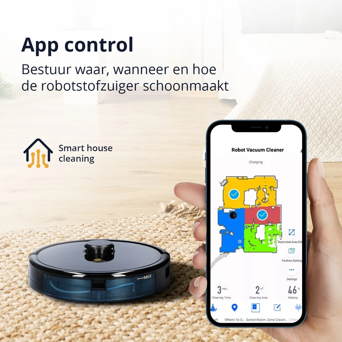 Onze robotstofzuiger kan bediend worden met de bijgeleverde afstandsbediening of smart app zodat je waar dan ook controle hebt. Zo selecteer je welke ruimte moet worden schoongemaakt met ééndruk op de knop, handig toch!?