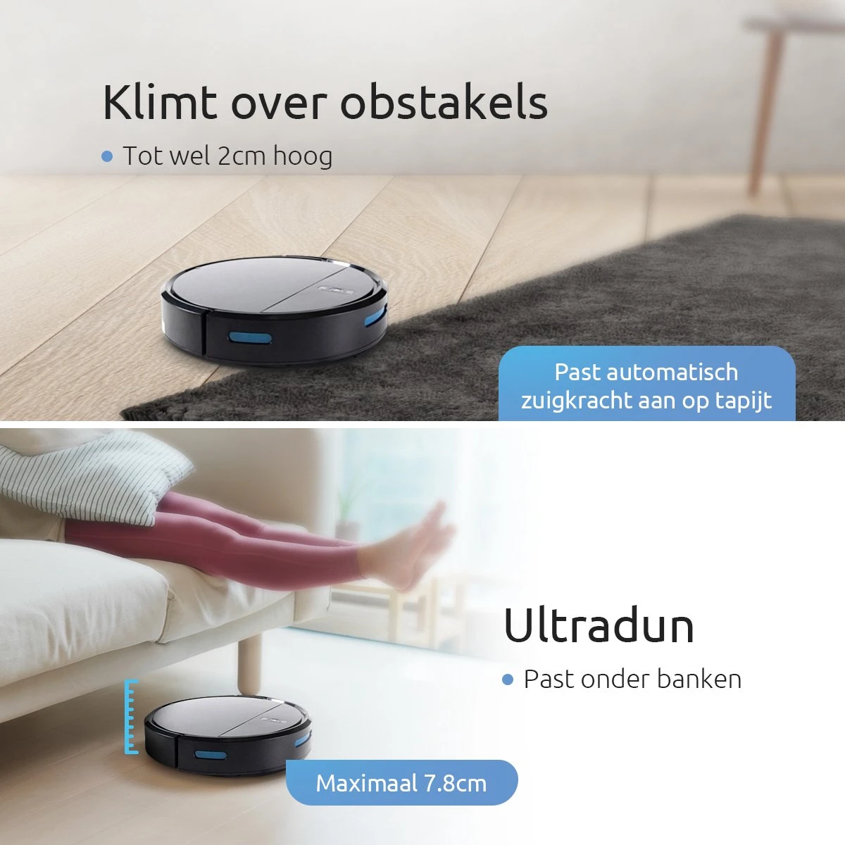 Jouw robotstofzuiger is voorzien van een plat mondstuk, ruim stofreservoir en super sterke 2000PA vacuüm kracht welke een bereik tot wel 99% van alle stofjes op het oppervlak heeft. Met een hoogte van slechts 7,8 centimeter wordt ook de vloer onder tafels en banken gereinigd en zijn huisdierharen, pollen en vuilresten écht verleden tijd.