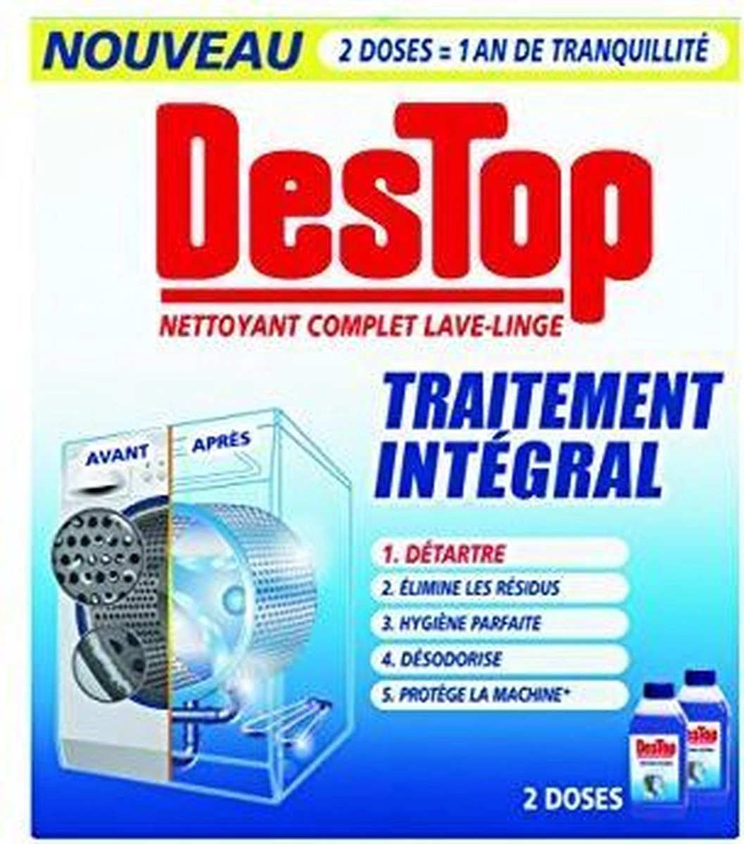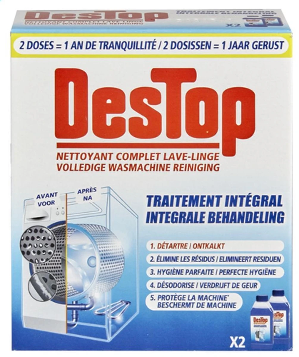 Regelmatig gebruik van uw wasmachine veroorzaakt kalkaanslag en laat residuen achter op vitale onderdelen van uw wasmachine. Dit kan de goede werking van uw machine beïnvloeden en de kwaliteit ervan aantasten. Dankzij zijn unieke formule garandeert Destop wasmachine reiniger een volmaakt propere wasmachine voor een onberispelijke was. Het reinigt grondig uw wasmachine met 5 krachtige acties :