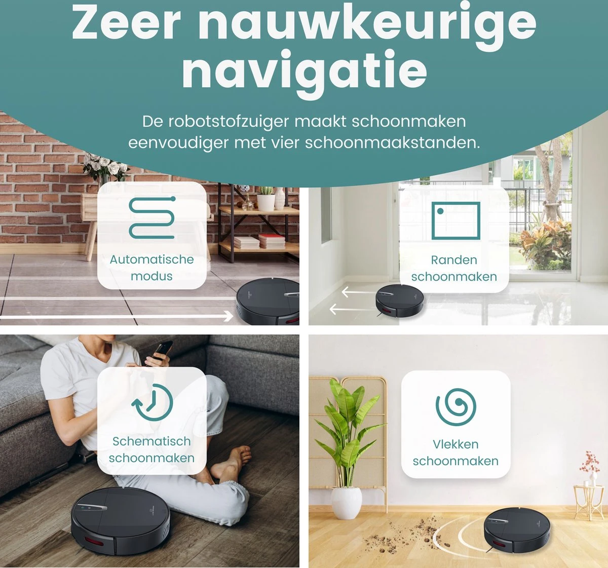 - De robot werkt systematisch en gaat niet kris kras door de kamer heen.