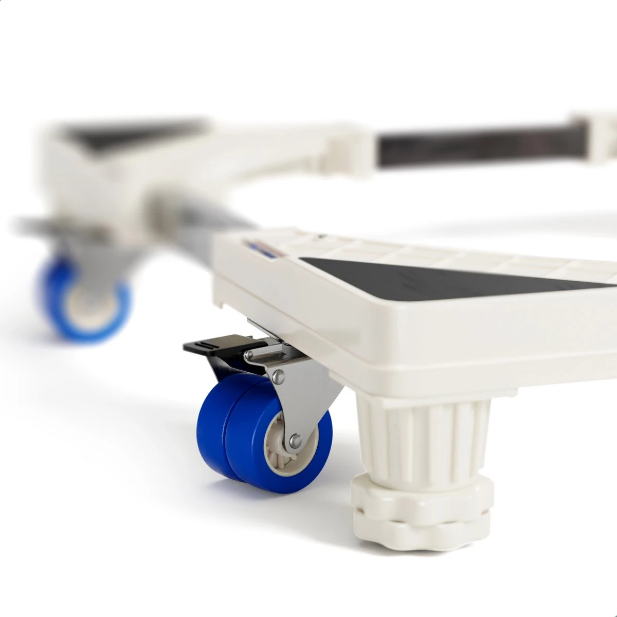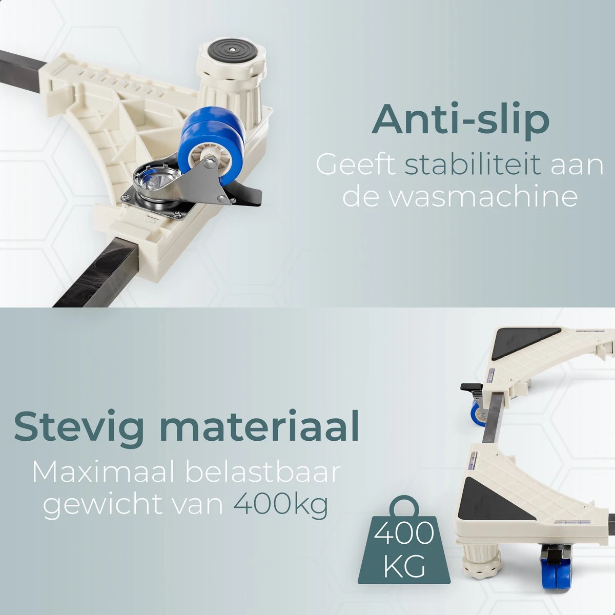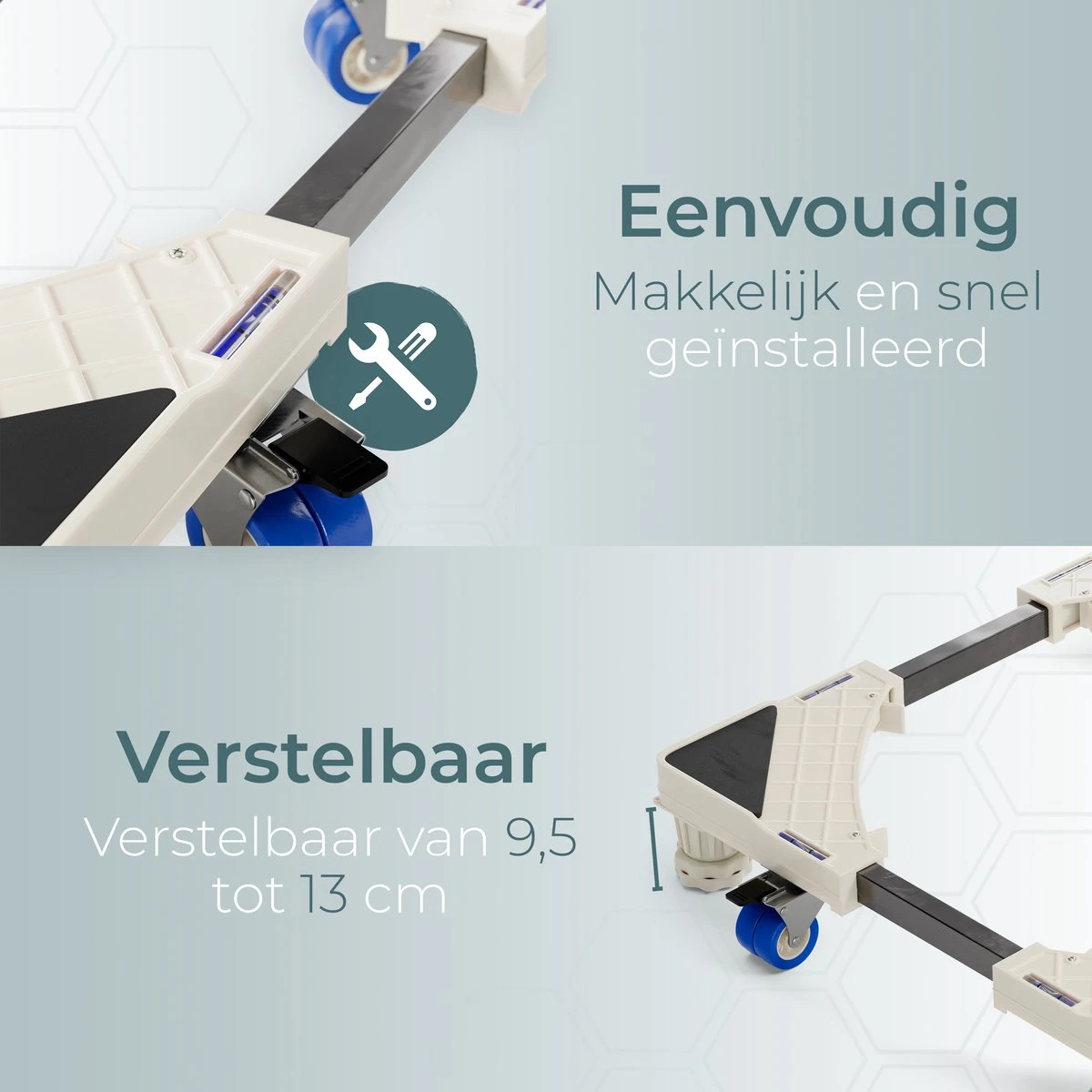 Echter is het nog niet voorbij met de pret. Deze nieuwe versie is naast de verstelbare pootjes ook nog eens voorzien van wieltjes. Hiermee kun je eenvoudig je wasmachine, vaatwasser of koelkast verplaatsen.
