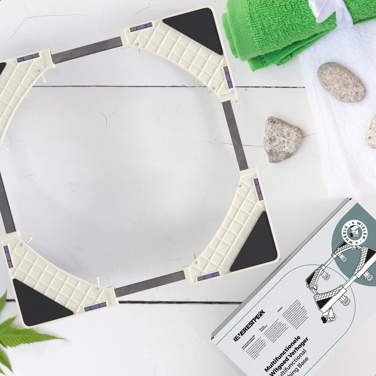 Het in elkaar zetten is een fluitje van een cent. Je hoeft alleen maar de onderdelen (zie afbeelding) aan elkaar te schroeven en vervolgens in elkaar te klikken en voilà . De wasmachine verhoger van EverestPeak is klaar voor gebruik!