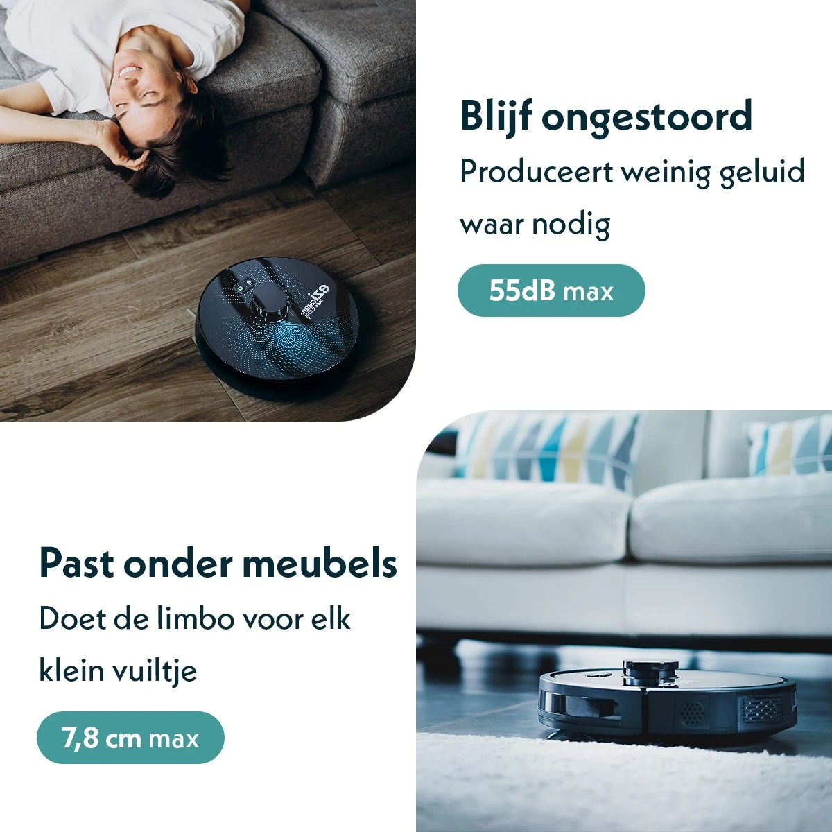 Onze ingenieurs hebben bij het ontwerpen van de Eziclean® x850 Aqua-Connect robotstofzuiger met dweilfunctie bijzondere aandacht geschonken aan het geluidsniveau. Met een geluidsniveau van 55dB is deze robotstofzuiger één van de stilste op de markt, dit in tegenstelling tot andere robotstofzuigers die vaak 75+dB halen. Geniet ongestoord van je favoriete Netflix serie!