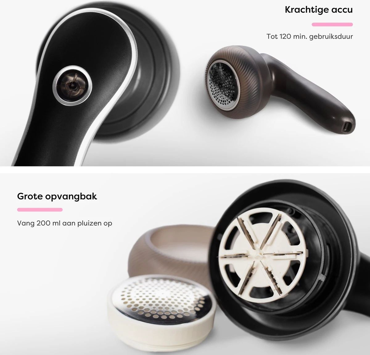 Het ergonomisch design van onze pluizenverwijderaar is ontworpen voor comfortabel en langdurig gebruik. Het handvat is ergonomisch gevormd en ligt perfect in de hand, waardoor het apparaat prettig en veilig is om vast te houden tijdens het gebruik.