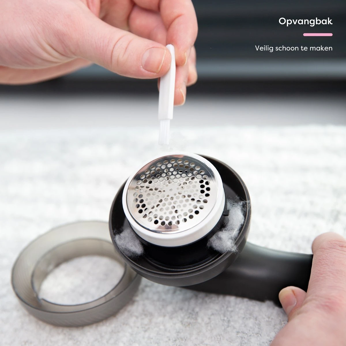 Onze Finenza pluizenverwijderaar is eenvoudig schoon te maken. U kunt het apparaat eenvoudig uit elkaar te halen, zodat u de pluisjesverwijderaar gemakkelijk kunt reinigen en onderhouden. De pluisjes en haren worden opgevangen in een grote opvangbak die gemakkelijk te verwijderen en te legen is. Dit bespaart u veel tijd en moeite bij het opruimen van de opgevangen pluisjes en haren.