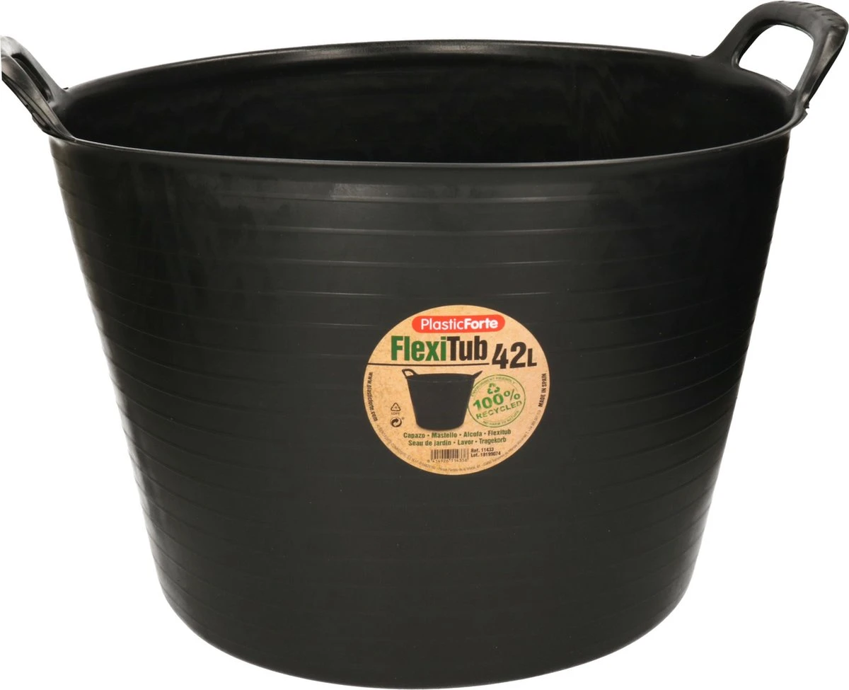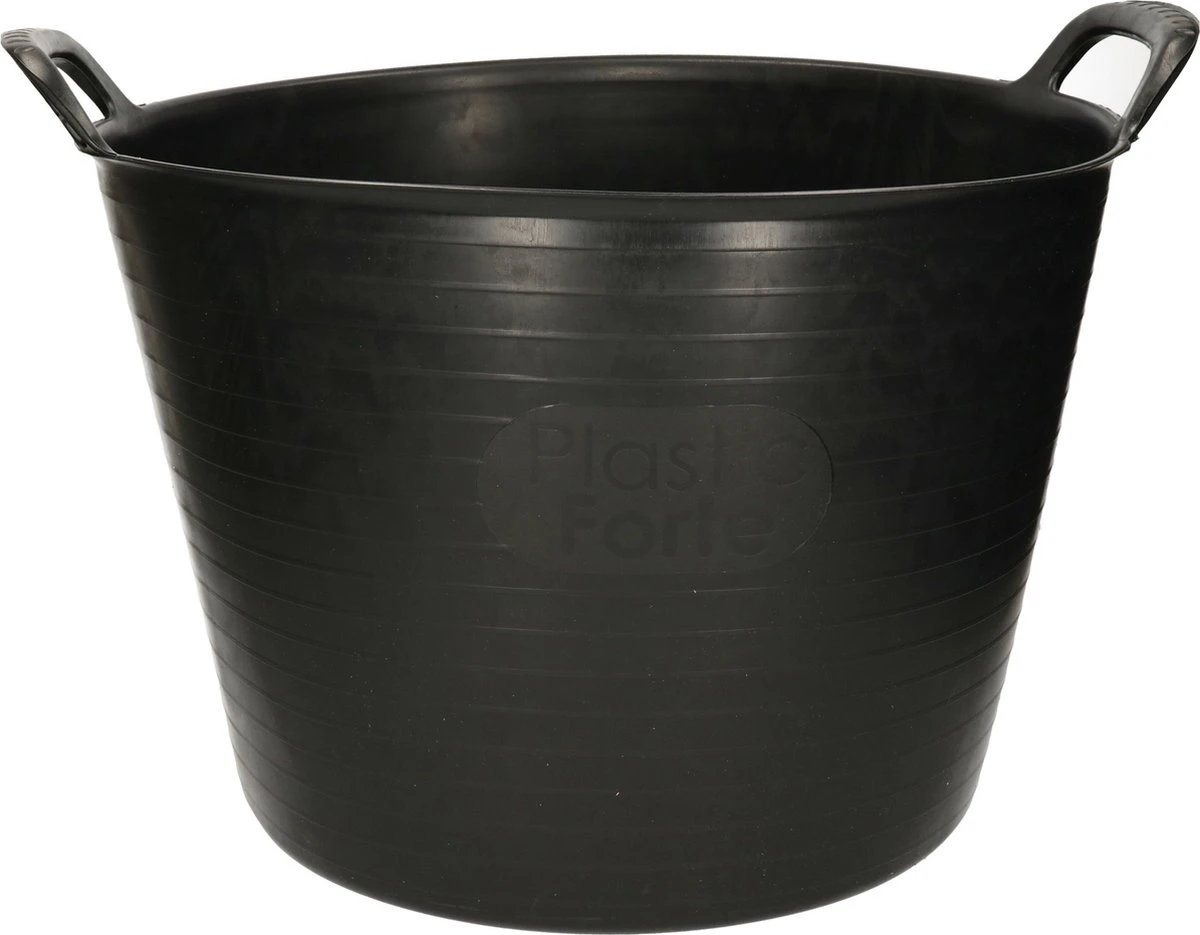 Zwarte bak/mand met twee handvatten en een inhoud van 40 liter, gemaakt van flexibel kunststof.