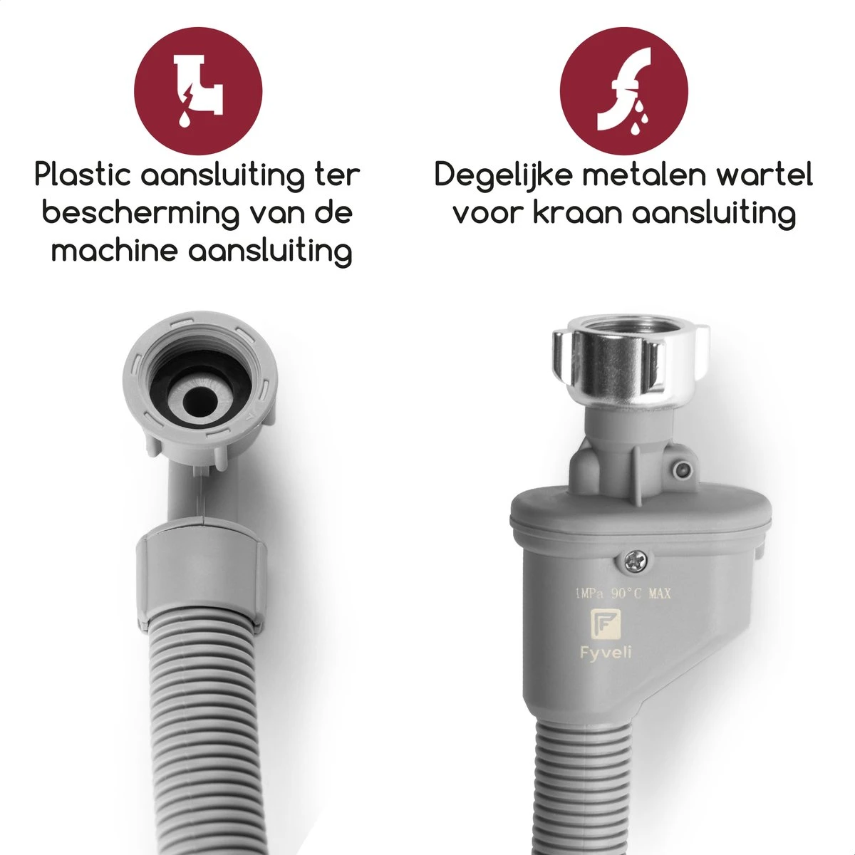 De Fyveli aanvoerslang kan aangesloten worden op nagenoeg elke wasmachine of vaatwasmachine of andere huishoudelijke apparaten die regelmatig water nodig hebben. De toevoerslang is voorzien van een waterslot en een gaasfilter. De toevoerslang is aan beide uiteinde voorzien van een 3/4” wartelaansluiting met pakking waardoor de slang makkelijk lekdicht aan te sluiten is.