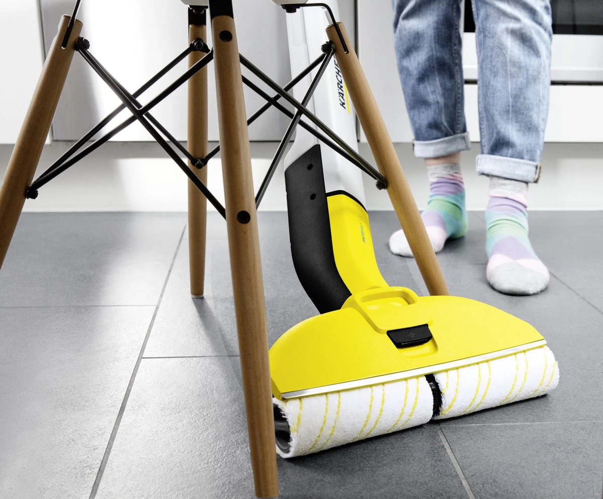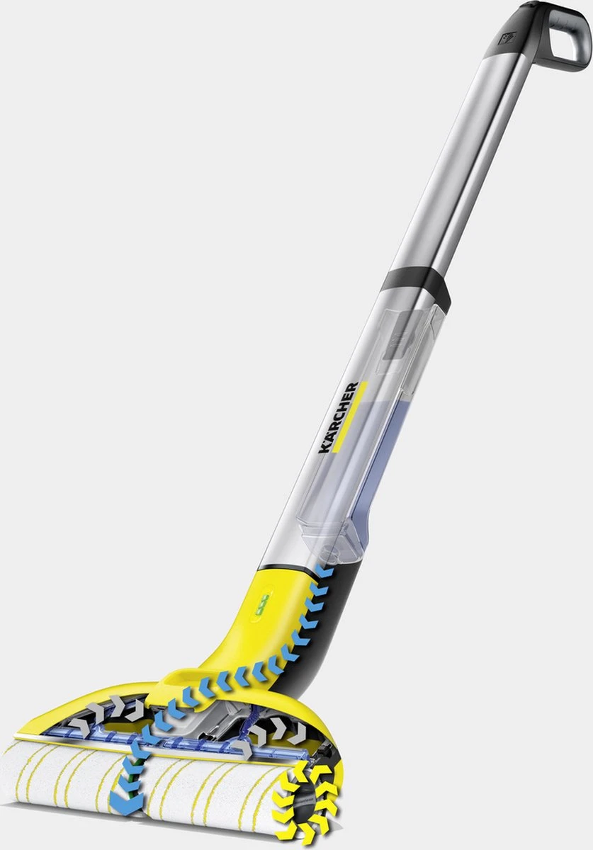 Vlekken en spatten tot aan de rand verwijderen – zonder emmer of onvermoeibaar schrobben. Niet mogelijk? Denk nog eens na! De accumop EWM 2 met zijn twee tanks maakt dit mogelijk – en conventionele dweilen overbodig. De roterende rollen worden constant bevochtigd met vers water terwijl het verzamelde vuil in de vuilwatertank terechtkomt. Het apparaat laat vloeren tot 20% schoner achter dan conventionele moppen*. Dankzij de slanke vorm en het flexibele draaischarnier komt de EWM 2 niet alleen gemakkelijk onder meubels, maar bespaart hij ook opbergruimte. De droogtijd van de vloer is slechts twee minuten, waardoor het perfect geschikt is voor gebruik op alle soorten harde vloeren (bijv. tegels, parket, laminaat, PVC en vinyl). De krachtige lithium-ion-accu heeft een looptijd van ca. 20 minuten. Hierdoor reinig je tot 60 m² vloeroppervlak met het apparaat.