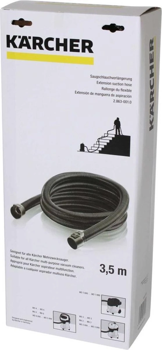 Verlengslang 3,5 mtr tbv nat/droogzuiger. De verlengslang van 3,5 m is geschikt voor alle Kärcher multifunctionele stofzuigers uit de Home & Garden serie en garandeert een grote actieradius en een grotere bewegingsvrijheid.
