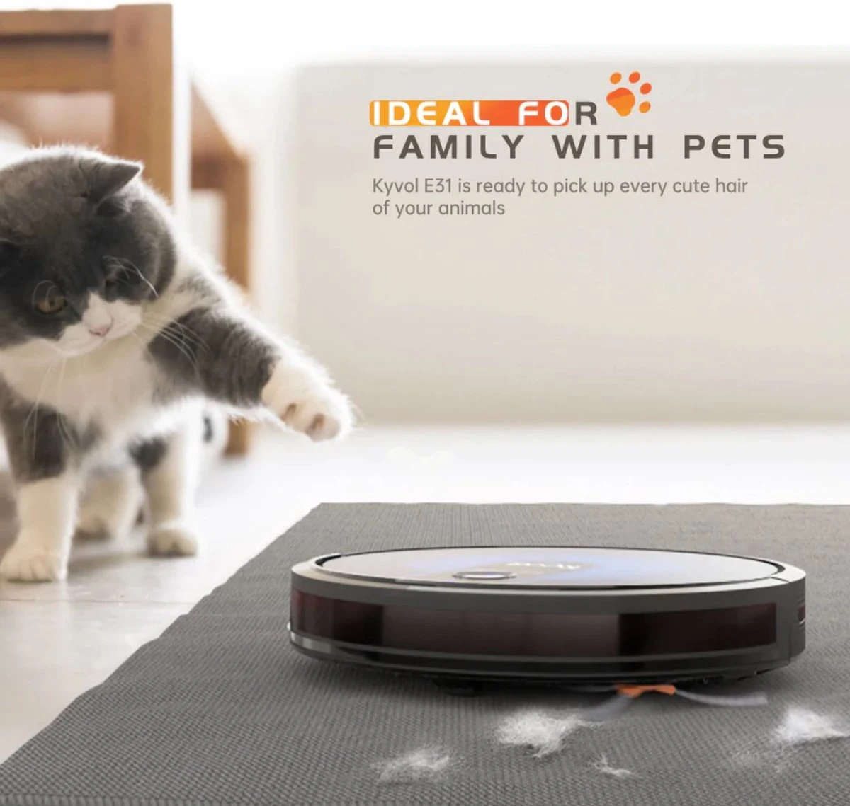 De E31 is ook effectief tegen dierenharen. De grote borstel aan de onderkant van de robot vangt de haren op van zowel mens als dier. Dit maakt de E31 een stuk effectiever dan robotstofzuigers zonder deze grote midden-borstel.
