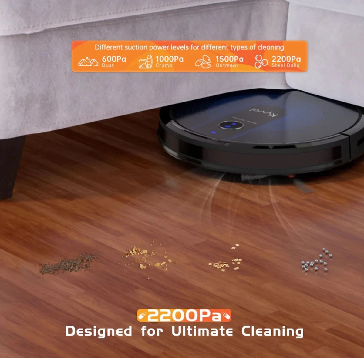 De Kyvol E31 heeft 3 verschillende standen in zuigkracht. De laagste (en stilste) stand heeft een zuigkracht van 600 Pa. In de standaard stand is dit een 1000 Pa met de zuigkracht oplopend tot een krachtige 2200 Pa in de hoogste stand. Bovendien herkent de robot kleden en tapijt waarop automatisch de hoogste stand wordt ingeschakeld. Deze “carpet boost” functie zorgt ervoor dat de E31 ook het diepliggend stof bereikt voor een grondige reiniging van het tapijt.