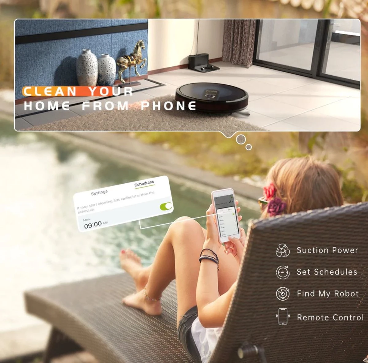 Verbind de Kyvol E31 met de app voor diverse opties. Kies de zuigstand, pas het watervolume aan, stel een rooster in en volg de robot live. Het is ook mogelijk om de robot handmatig te besturen of met je stem via Amazon Alexa of Google Assistant.