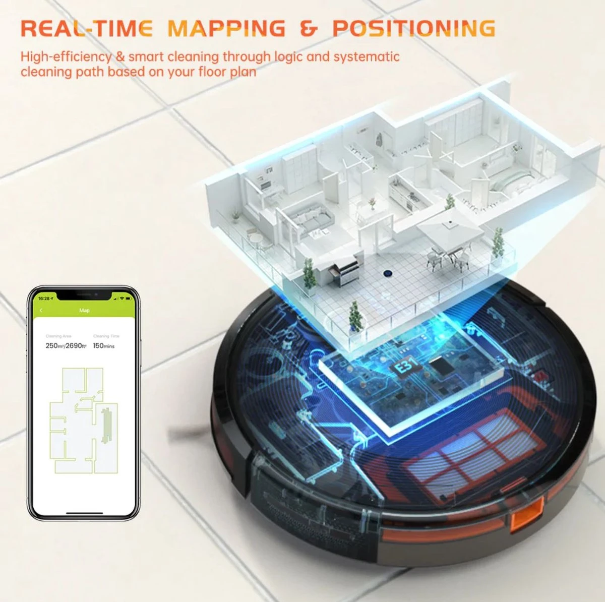 Geen willekeurig patroon maar een systematische route dankzij gyroscoop navigatie. Een gyroscoop kan je zien als een soort intern kompas waardoor de E31 efficiënt te werk gaat. Deze vorm van navigeren is tot 30% efficiënter dan een robotstofzuiger die willekeurig te werk gaat.