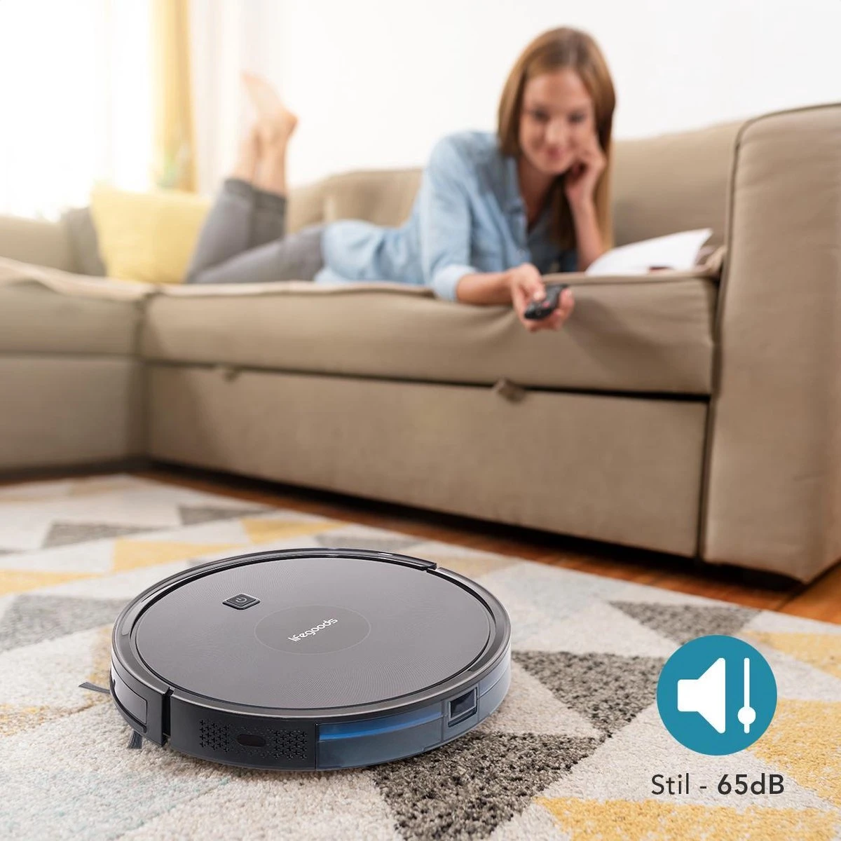 De robotstofzuiger is met een geluidsniveau van 65dB zeer stil. Zo wordt je dagelijks leven thuis niet gestoord door een lawaaiige stofzuiger. Gebruik de stofzuiger zelfs als je thuis aan het werk bent!