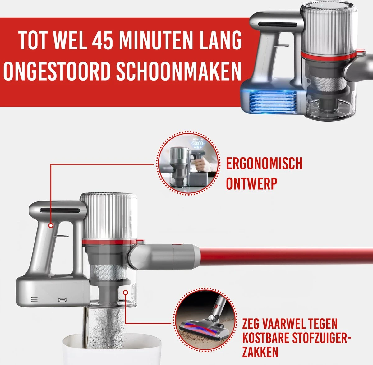 De ingebouwde 2200mAh lithium batterij zorgt ervoor dat je binnen 4 uur de accu volledig hebt opgeladen. Vervolgens kan je met een volledig opgeladen accu met de lage stand tot wel 45 minuten lang gebruik ervan maken. Bij gebruik van de hoge stand kan het maximaal 25 minuten, zodat je kleinere vloeroppervlakten effectief kan reinigen. Met deze stofzuiger beschik je over een langere accuduur en levensduur.