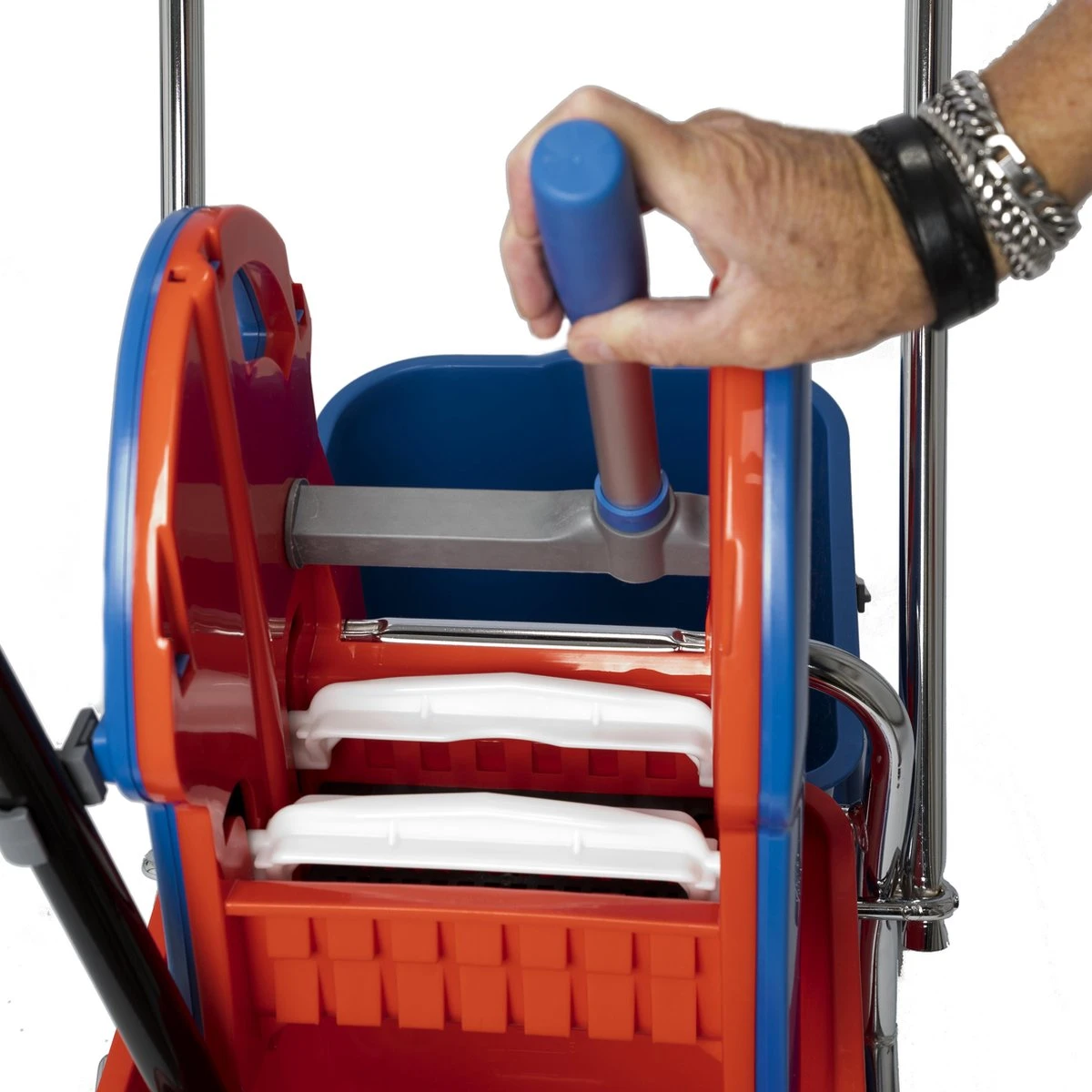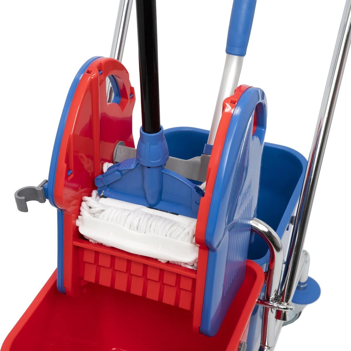 Het frame van deze mopkar is gefabriceerd van metaal wat duurzaam verchroomd is. De inhoud van de emmers bedraagt wanneer maximaal gevuld 20 liter. Gebruik voor juist gebruik de blauwe emmer voor het schone water en de rode emmer voor het uitgeperste water. De meeste gangbare moppen passen in de kunststof pers van deze dweilwagen maar bij deze set worden de perfecte moppen geleverd. Met behulp van de duwbeugel verplaatst u deze mopkar gemakkelijk door uw woning of kantoor. De mopsteel wordt eenvoudig in elkaar geschroefd zodat het een solide geheel wordt. Door de rubberen wielen rijdt de wagen zeer soepel over de vloer.