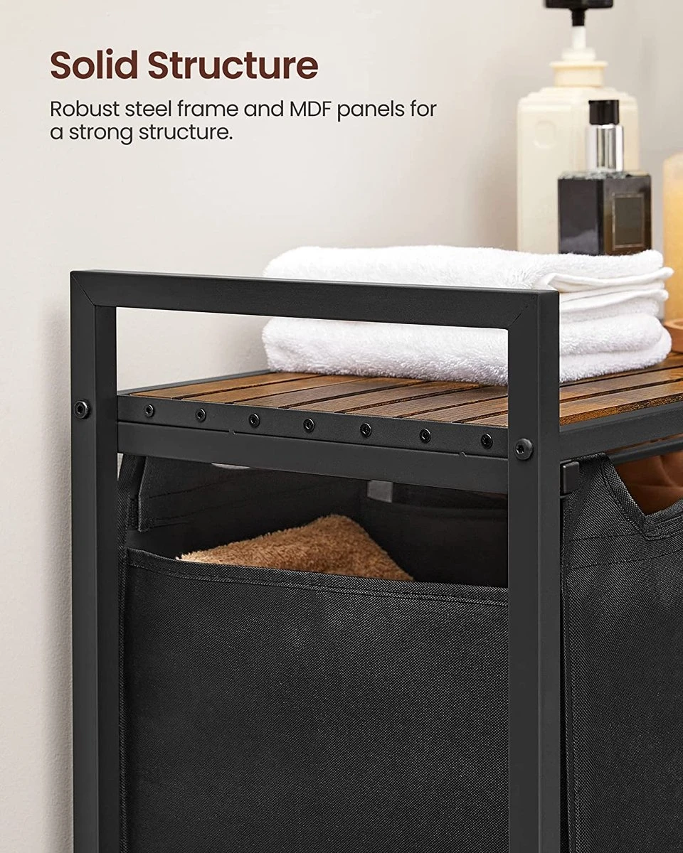 Handige wasmand: 3 tassen, 1 plank – zo veel opbergruimte! Sorteer je wasgoed met de drie stoffen zakken (Totaal 82,5 Liter) en plaats de wasmiddelen en wasverzachters op de plank. Al je opbergbehoeften voor een luchtige wasdag worden verwelkomd door deze wasmand.