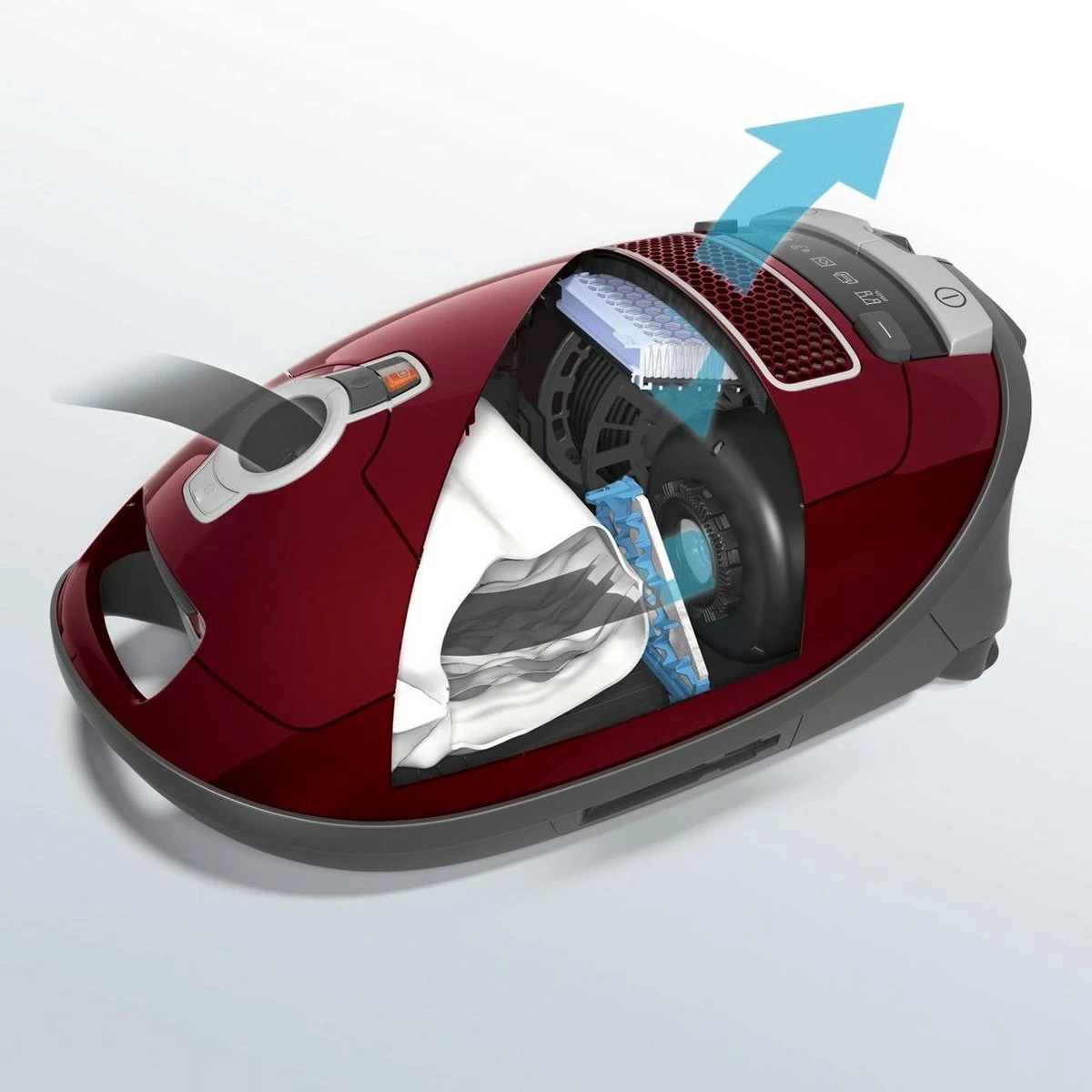 De Miele Complete C3 Score Red PowerLine stofzuiger is ideaal voor het zuigen van harde en zachte vloeren. Met deze Miele stofzuiger hoef je niet meer te bukken door de comfortabele plus/min-voetbediening en de motor die automatisch wordt uitgeschakeld. Heb je een stofallergie? De Complete C3 Score Red PowerLine bevat een Air-Clean filtersysteem waardoor meer dan 99,9% van de stofdeeltjes wordt gefilterd. Het filter bestaat uit 12 lagen en zorgt zo voor optimale hygiëne. De Complete C3 PowerLine wordt met drie hoogwaardige toebehoren geleverd: meubelzuigmond, kierenzuiger en reliëfborstel met zacht natuurhaar. Ze zijn stofvrij opgeborgen onder de klep en zijn daardoor altijd bij de hand. Daarnaast heeft de Miele Complete C3 Score PowerLine een extra lang snoer van 8.5 m, waardoor hij ideaal is voor grote ruimtes zonder dat je van stopcontact hoeft te wisselen.