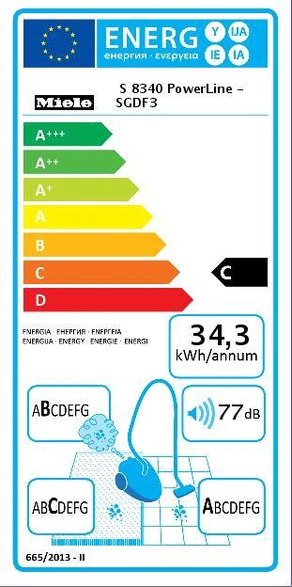 Miele S 8340 PowerLine – SGDF3. Maximaal ingangsvermogen: 550 W. Soort: Cilinderstofzuiger, Soort reiniging: Droog, Stofzuigercontainer type: Stofzak, Stof capaciteit: 4,5 l. Stofzuiger luchtfiltering: Miele AirClean, Vuilafscheidingsmethode: Filtrerend, Geluidsniveau: 77 dB. Kleur van het product: Wit