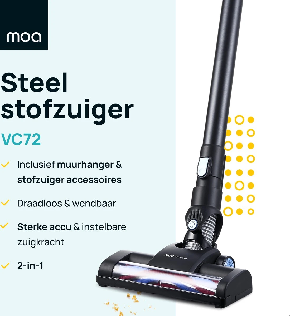 Met de MOA VC72 Steelstofzuiger maak je vervelende klusjes makkelijk. Draadloos en wendbaar met een instelbare zuigkracht voor vieze en minder vieze vloeren. Inclusief accessoires; zo klaar je elke klus.