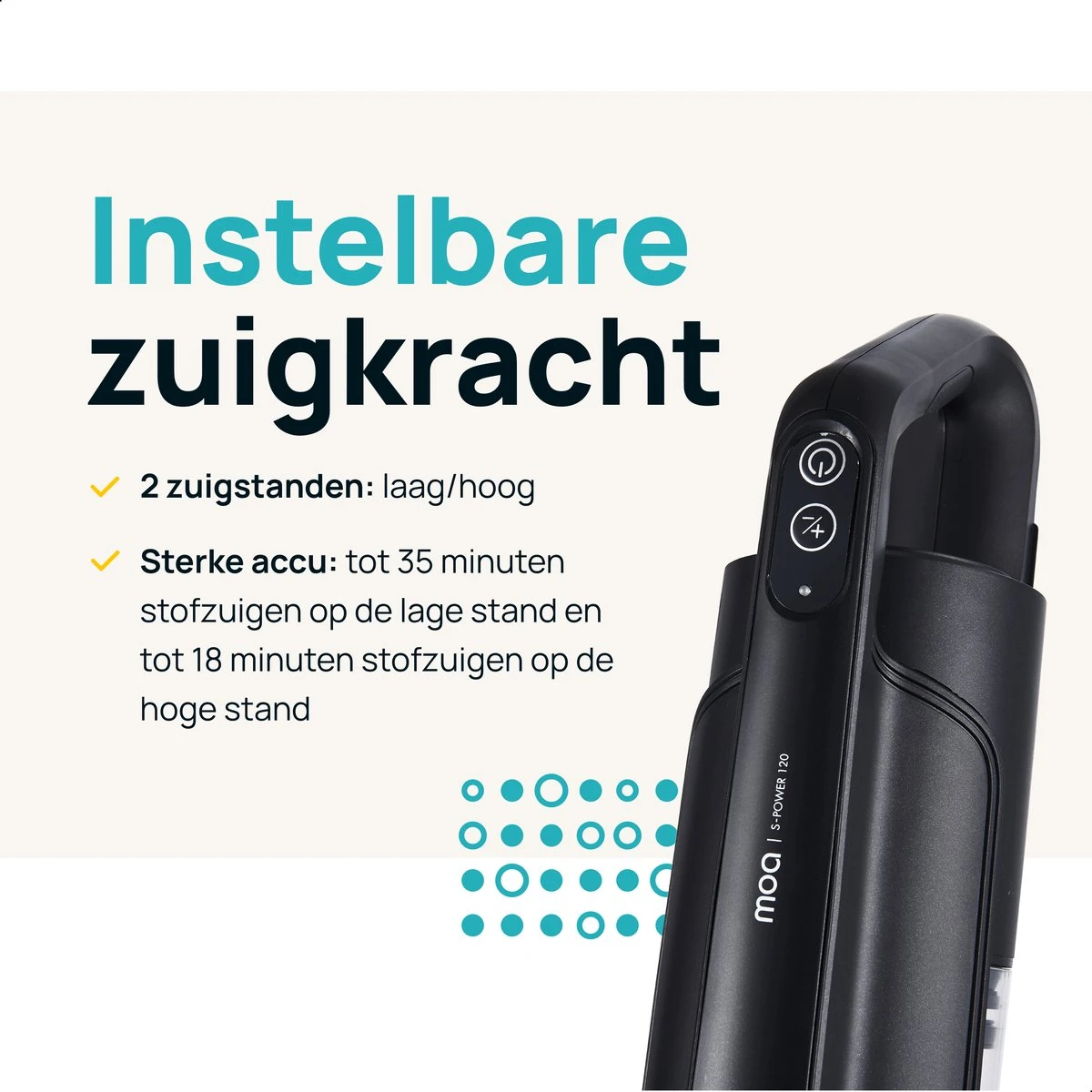 Instelbare zuigkracht – Kies de lage zuigkracht bij lichte vervuiling of de hoge zuigkracht bij grotere vervuiling. In de hoge stand gaat de accu tot 18 minuten mee.