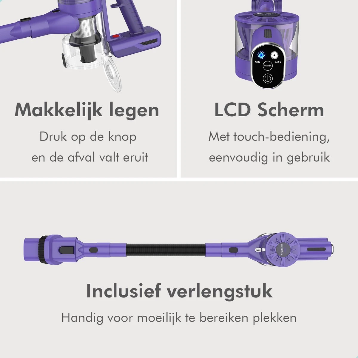 De Motionflow steelstofzuiger is draadloos, heeft een grote accu en is tot wel 35 minuten te gebruiken. Met een zuigkracht van 12KPA en 22KPA (200 watt) en een hoogwaardig uitwasbaar hepa filter is deze stofzuiger perfect voor huishoudelijk gebruik. Daarbij is de snoerloze steelstofzuiger binnen 2,5 uur opgeladen dankzij de snellader. De krachtige en stille motor is voorzien van cyclone force technologie voor optimaal gemak. De stofzuiger bestaat uit een uitgebreide 6-delige set die je met de handleiding snel in elkaar kunt zetten.