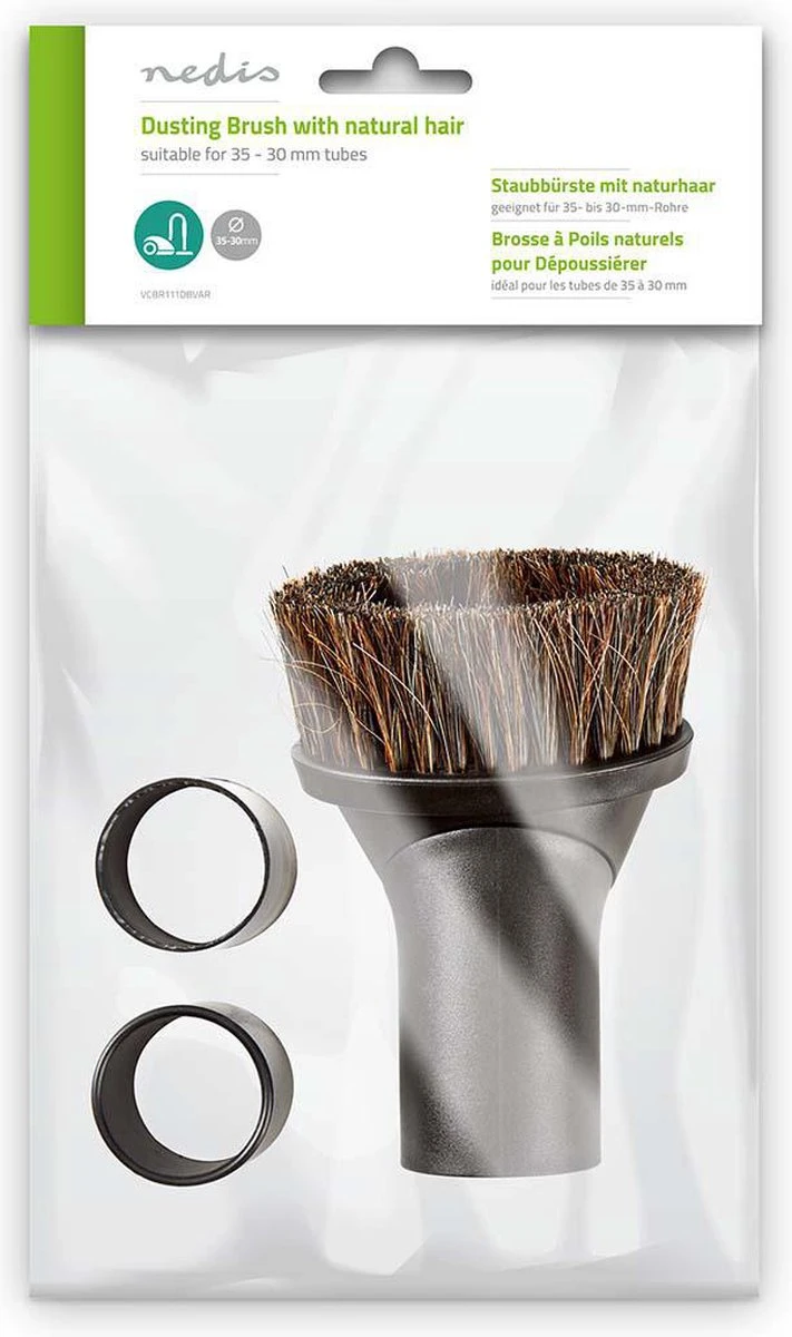 Deze stofborstel met een diameter van 35 – 30 mm past zich moeiteloos aan op verschillende oppervlakken. De borstel heeft natuurlijk haar en is ideaal voor het afstoffen van kostbare meubels of andere krasgevoelige voorwerpen. U kunt de borstel gemakkelijk aansluiten op uw binnenlandse stofzuiger met behulp van de meegeleverde aanpassingsringen.