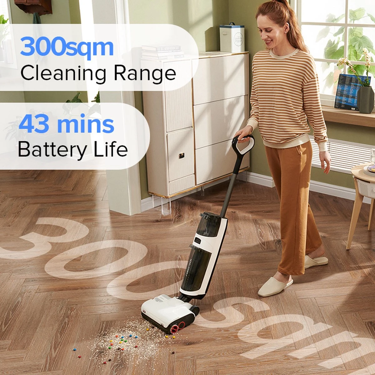 【Dual Power Sweeping】Steenveger heeft 2 motoren aan de voor- en achterkant, die 3 borstels aandrijven, 17000Pa super zuigkracht, verticaal luchtkanaal, 99,9% bacteriën dodend met alleen water. De batterij met grote capaciteit gaat tot 43 minuten mee en reinigt een oppervlakte tot 300m2.