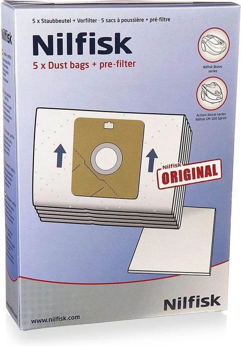 Nilfisk originele stofzuigerzakken. In de verpakking: 5 stofzakken + 1 motorfilter. Geschikt voor de Bravo R10P07A1