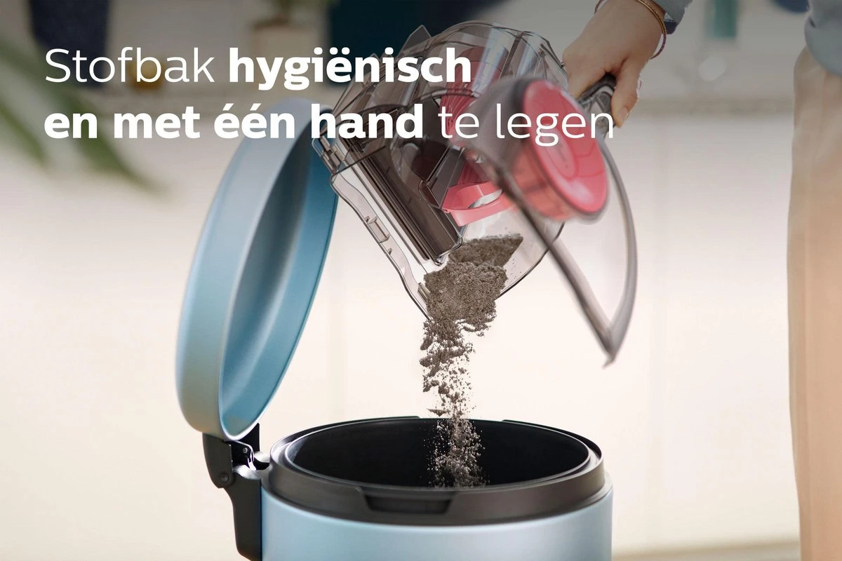 De stofbak is zo ontworpen dat deze eenvoudig en hygiënisch kan worden verwijderd en geleegd met één hand, om stofwolken te minimaliseren.