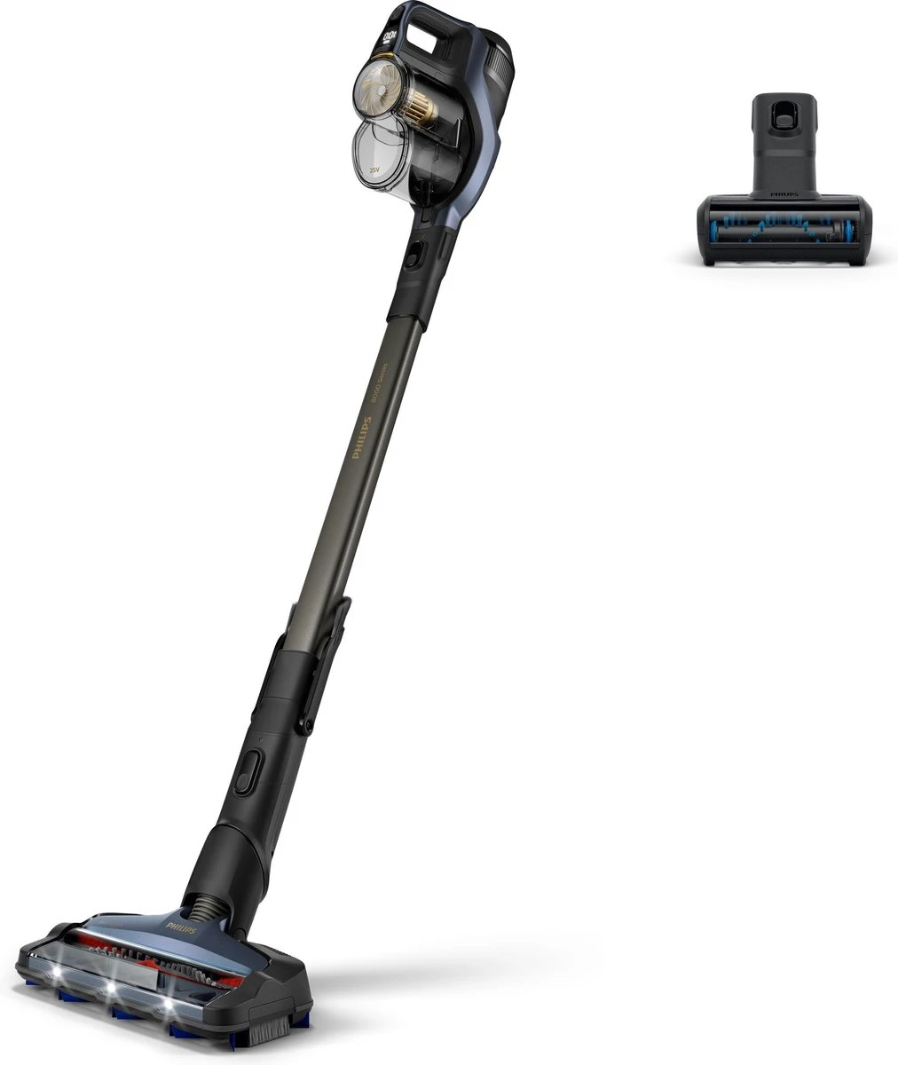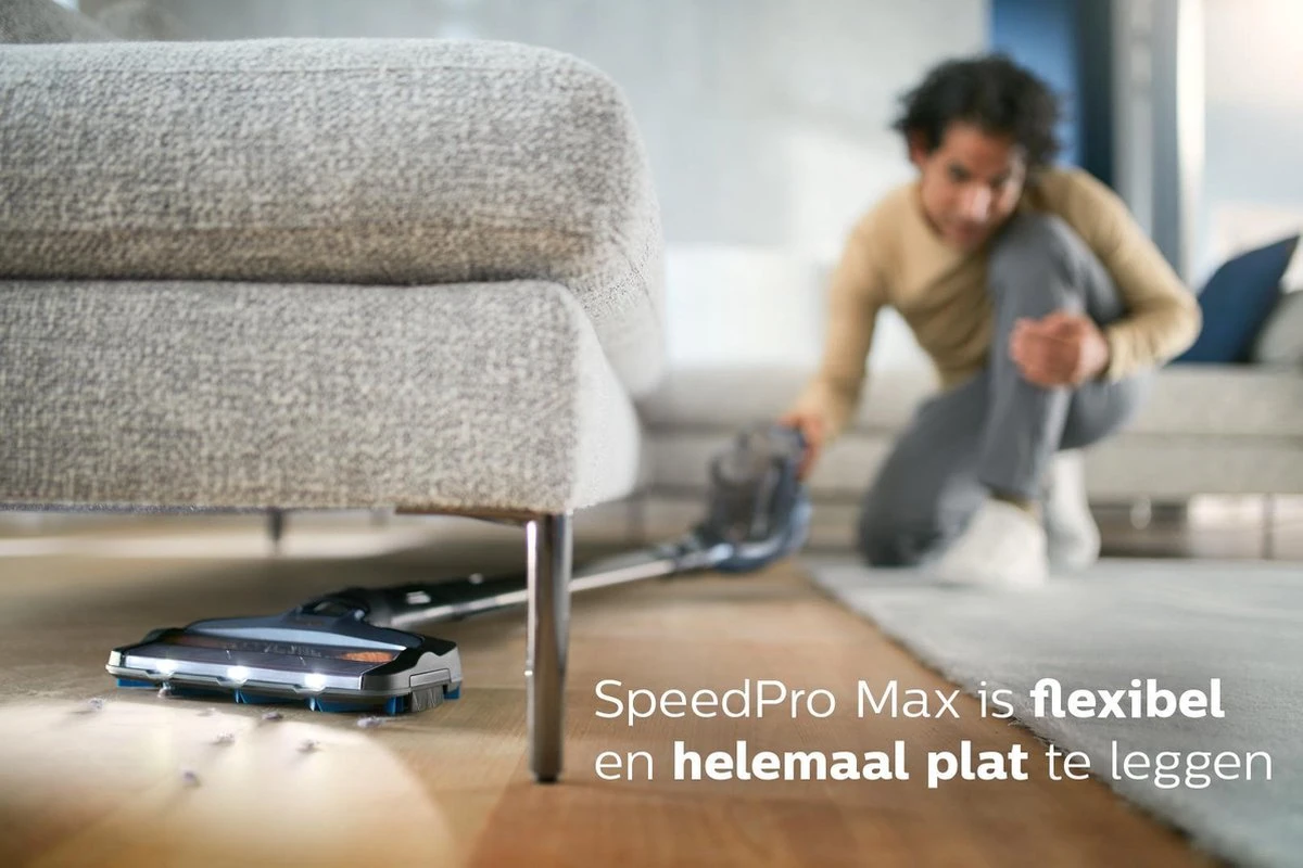 Haal de snelste manier van snoerloos schoonmaken in huis. Met iedere beweging neemt het 360 graden mondstuk stof en vuil op, zelfs achterwaarts en in hoeken. Bij de Philips 8000 series SpeedPro XC8043/01 zit het unieke 360 graden mondstuk die geschikt is voor alle typen vloeren, zodat wisselen niet nodig is. Gebruik de kleine gemotoriseerde turboborstel voor moeilijk te reinigen oppervlakken en de geïntegreerde borstel op de steel voor nauwe kieren. Met de krachtige PowerBlade-motor en de hoogwaardige 25.2V Li-ion batterij kun je, tot wel 70 minuten krachtig en zonder onderbrekingen, het hele huis schoonmaken.