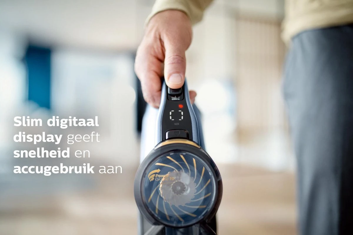 De PowerBlade motor is ontworpen voor hoge luchtstroom (>1100 l/min): De digitale Powerblade-motor genereert een extreem hoge luchtsnelheid, waardoor het mondstuk meer stof en vuil opneemt aan alle kanten. Dankzij het slimme digitale display kun je de motor altijd bedienen en de snelheid aanpassen aan jouw behoeften! Onze slimme digitale display laat je ook zien wanneer het filter moet worden gereinigd. De indicator voor filterreiniging helpt je bij het onderhoud, zodat het apparaat altijd optimaal presteert. Registreer de steelstofzuiger binnen drie maanden na aankoop op Philips.com voor 3 jaar additionele garantie op de digitale PowerBlade motor.