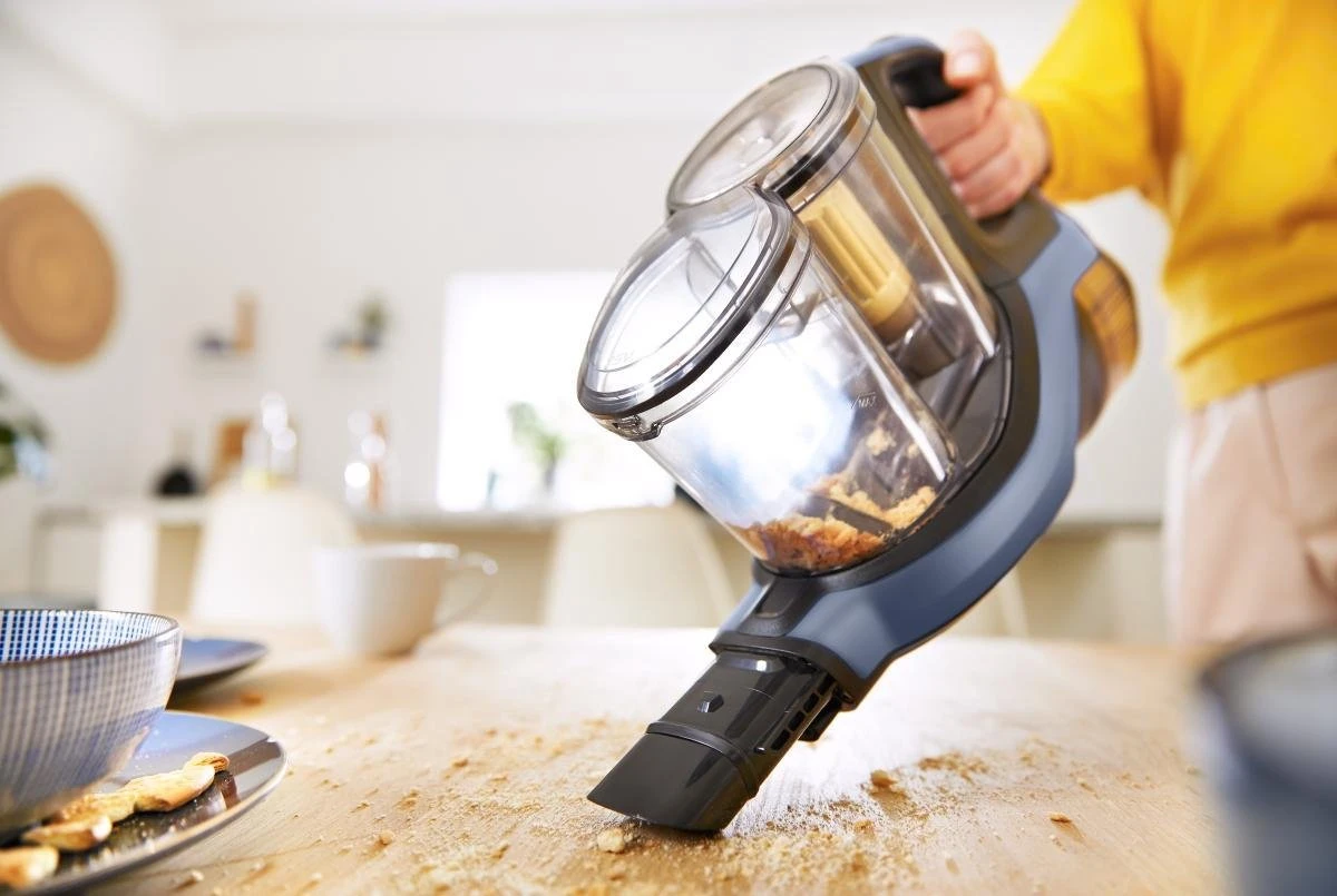 Schoonmaken op moeilijk bereikbare plekken: De Philips steelstofzuiger series 8000 is extreem goed gebalanceerd, flexibel en eenvoudig te manoeuvreren. De stofemmer zit aan de bovenkant, zodat je in een lagere hoek en zelfs helemaal plat op de vloer kunt schoonmaken. Hierdoor kun je zonder problemen onder laag meubilair stofzuigen.