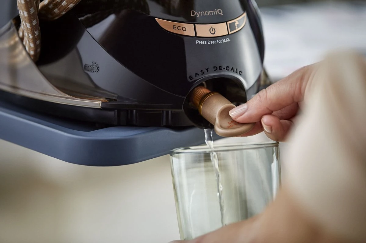 Regelmatig ontkalken beschermt de strijkijzer, verlengt de levensduur en zorgt voor de beste stoomprestaties. Het exclusieve Easy De-Calc Plus-systeem verzamelt continu kalkaanslag en is uitgerust met een indicatielampje en audiosignaal om je te laten weten wanneer het moet worden geleegd. Haal de stekker uit het stopcontact en laat het water en de kalkdeeltjes wegstromen.