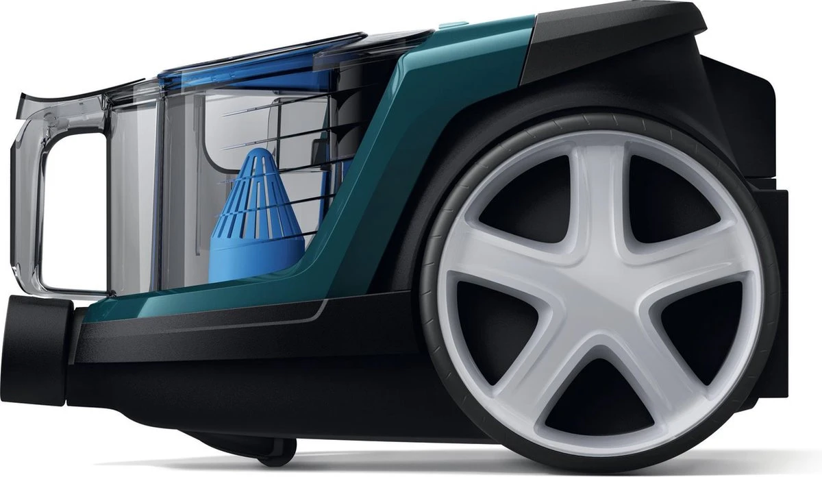 De grote rubberen achterwielen zorgen voor een vloeiende beweging tijdens het stofzuigen en zijn zacht op harde vloeren.