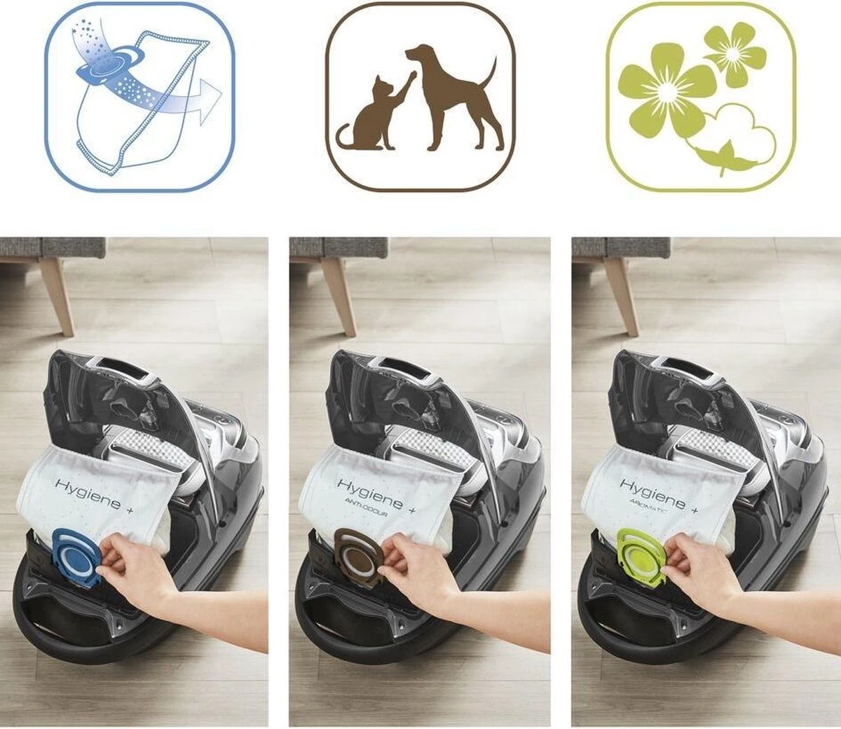De Hygiëne+ zak is het geheime wapen voor perfecte filtering en verbeterde hygiëne, vooral voor mensen met allergieën, omdat stofwolken en contact met stof voorkomen worden.