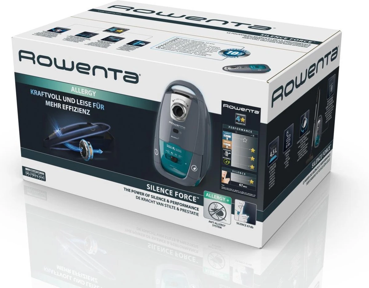 De Rowenta Silence Force Allergy+ RO7740 – Stofzuiger met zak combineert de Extreme Silence Technology met uitzonderlijke prestaties om de ultieme balans te creëren tussen diepe reiniging en extreem comfort. De zeer krachtige stille stofzuiger is uitgerust met geavanceerde opties van een extra grote capaciteit van 4,5 L tot een slank en gestroomlijnd ontwerp om schoonmaken eenvoudiger te maken.